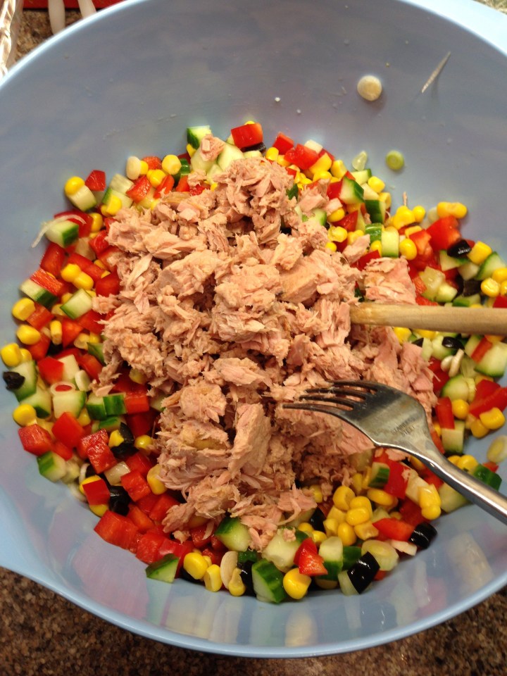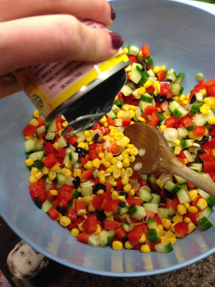 Pour all your chopped salad into a large bowl. Drain the sweetcorn, add to the bowl and mix everything in.