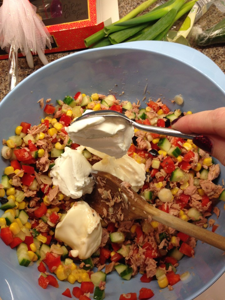 Add the mayonnaise and Greek yoghurt and stir through.