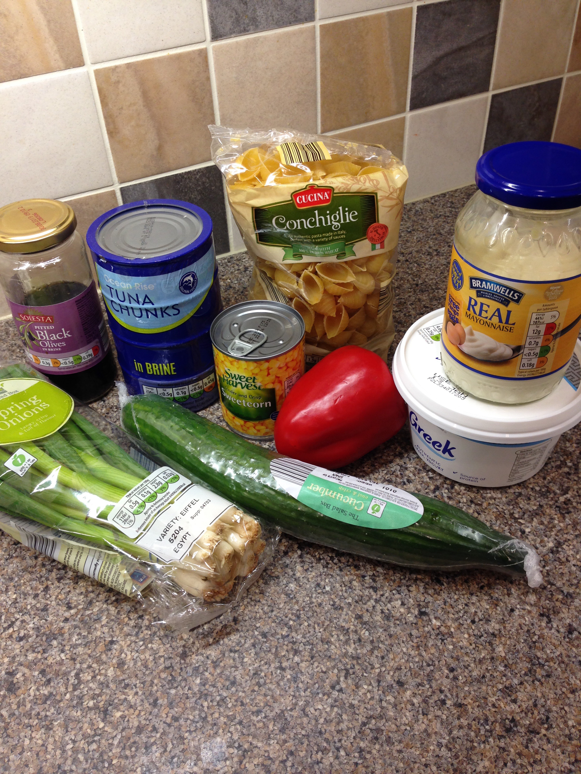 Put the pasta on to boil (follow packet guides for how long to cook for.) I like to use pasta shells (conchiglie) because they tend to hold more of the salad in them.