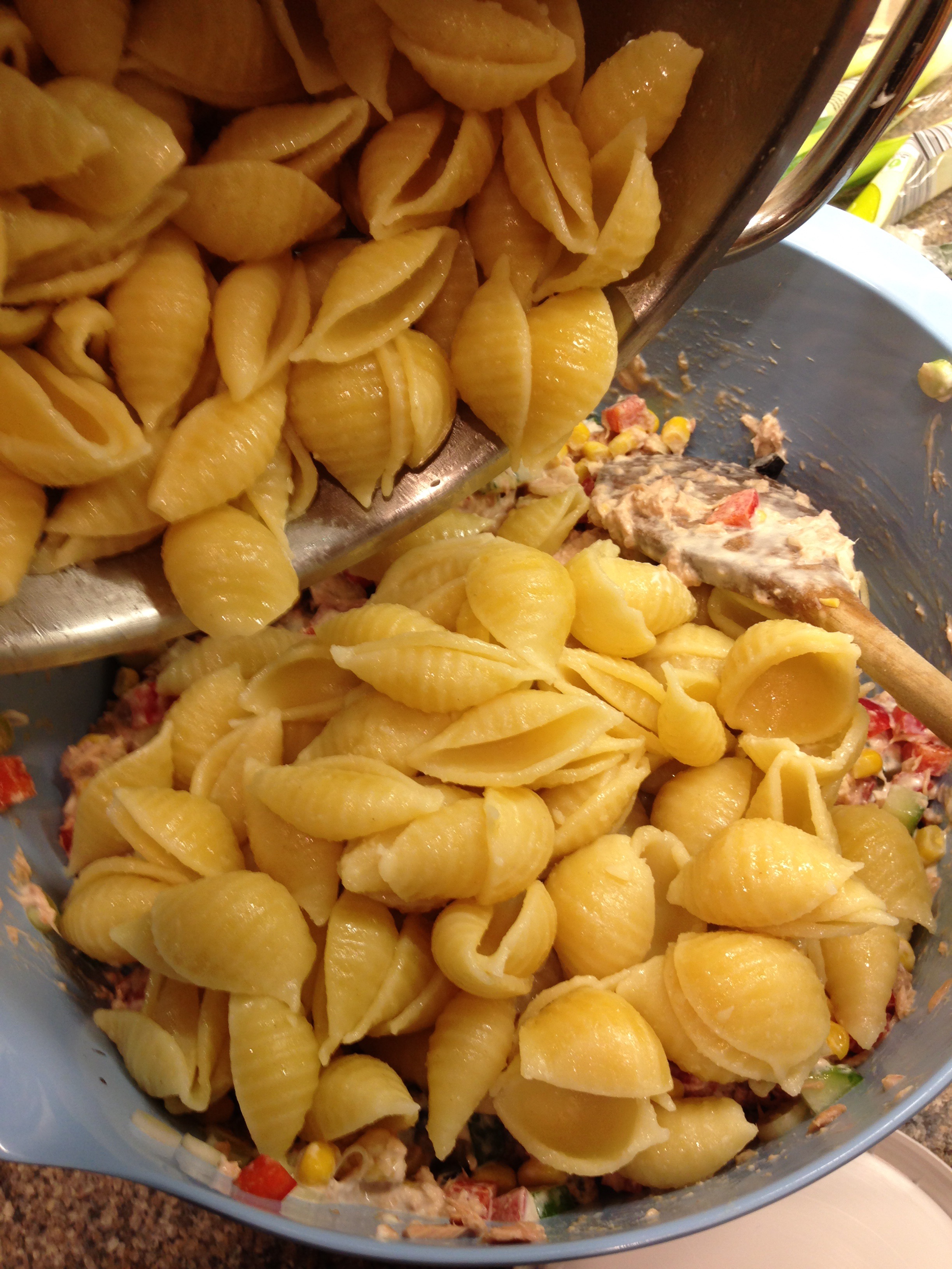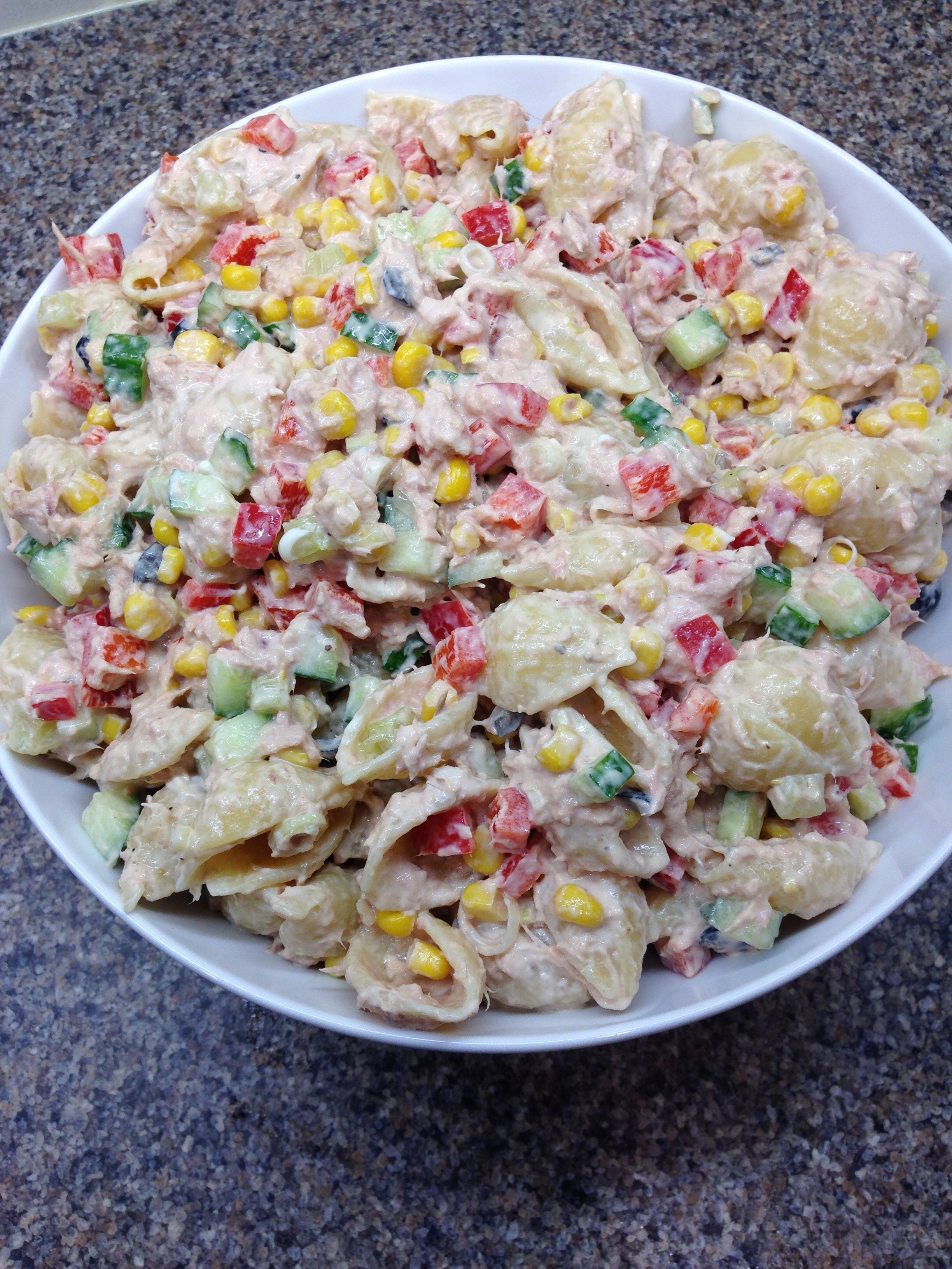 Finally add the cooled pasta and mix. If it’s a little dry add another spoon of mayonnaise and or yoghurt. Add a good amount of black pepper too!