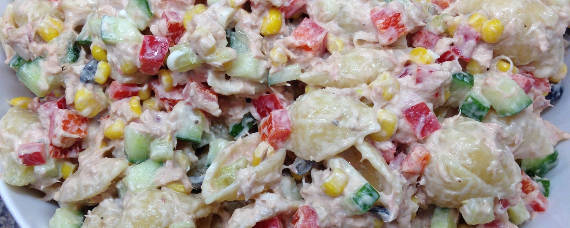 At this time of year there are plenty of family gatherings going on- this recipe is a great easy and tasty addition to any buffet! It’s also a fab meal all in itself- makes a fun change to sandwiches at lunchtime! This makes a very big bowlful. Half the recipe if you’re just doing lunch for the family!