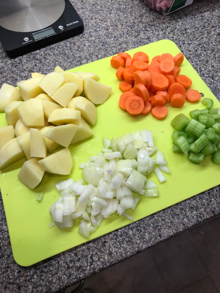 Peel the potatoes and cut into quarters, peel the carrots and cut into thick discs, roughly chop the onion and cut the celery into large chunks.