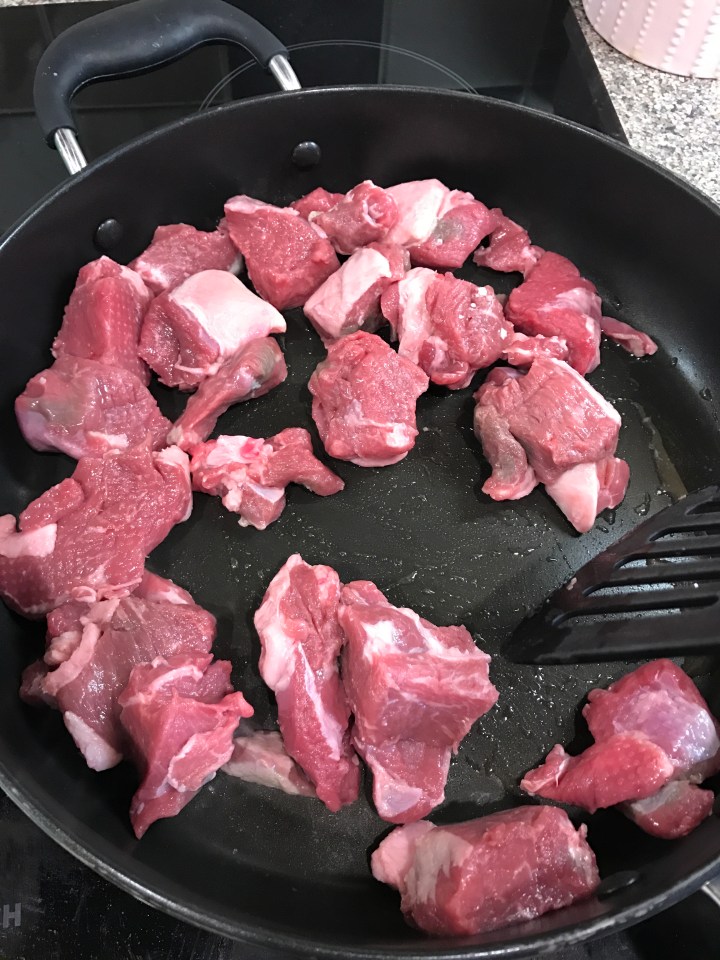 Add the lamb and fry on a medium high heat until you can’t see the red any more.