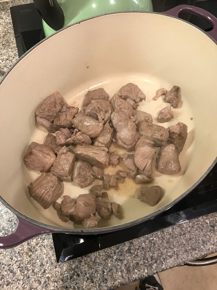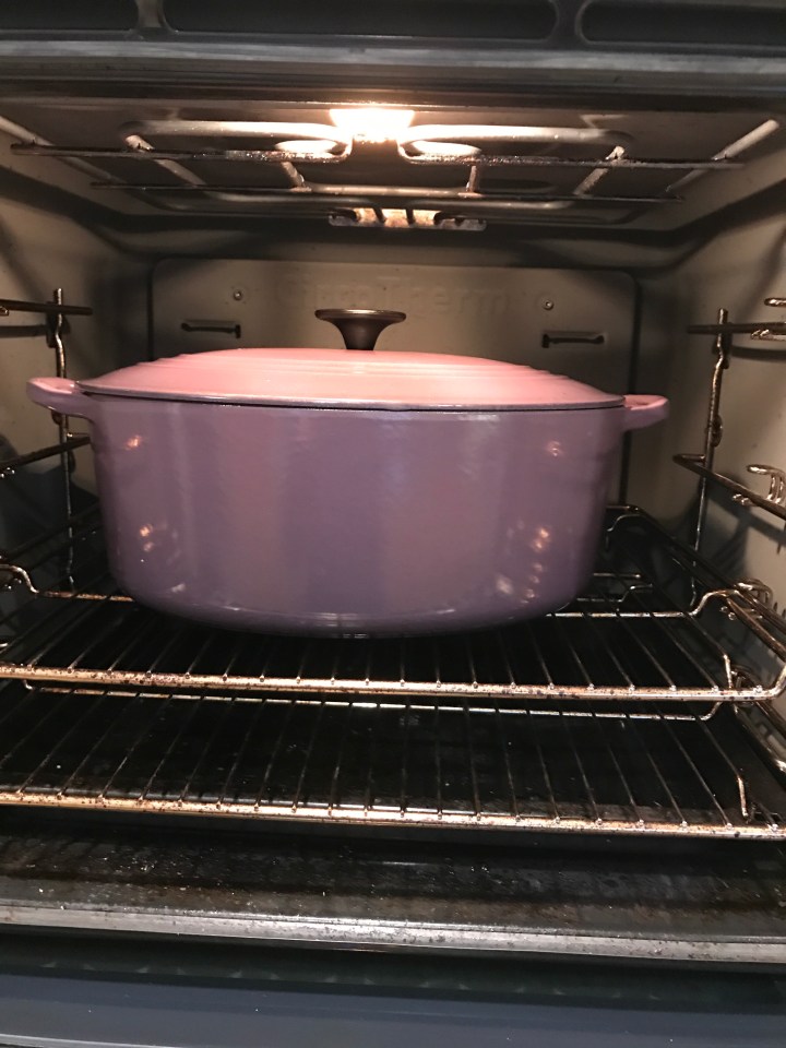 Put the lid on and pop into a pre-heated oven at 160 degrees for an hour (it will be in the oven for 2hrs before it’s done)