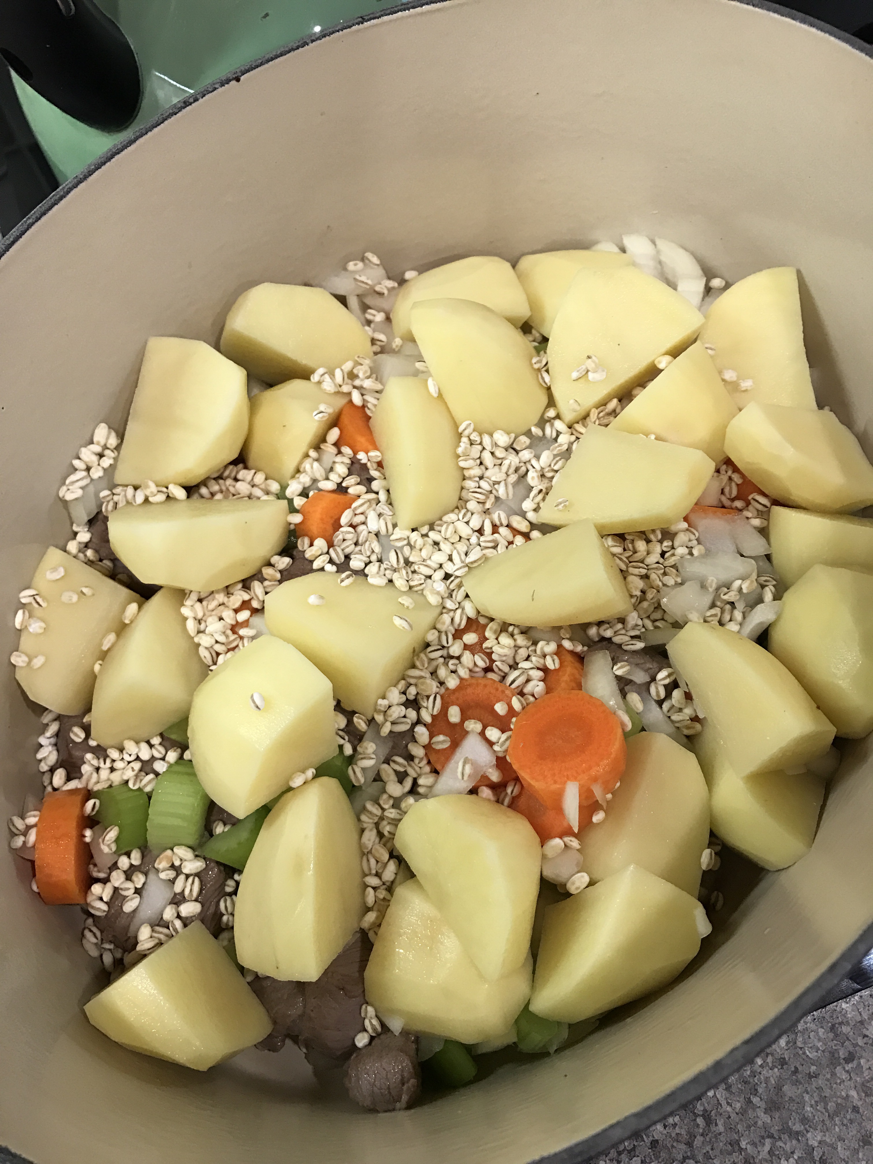 Add the potatoes, carrots, onions and celery on top