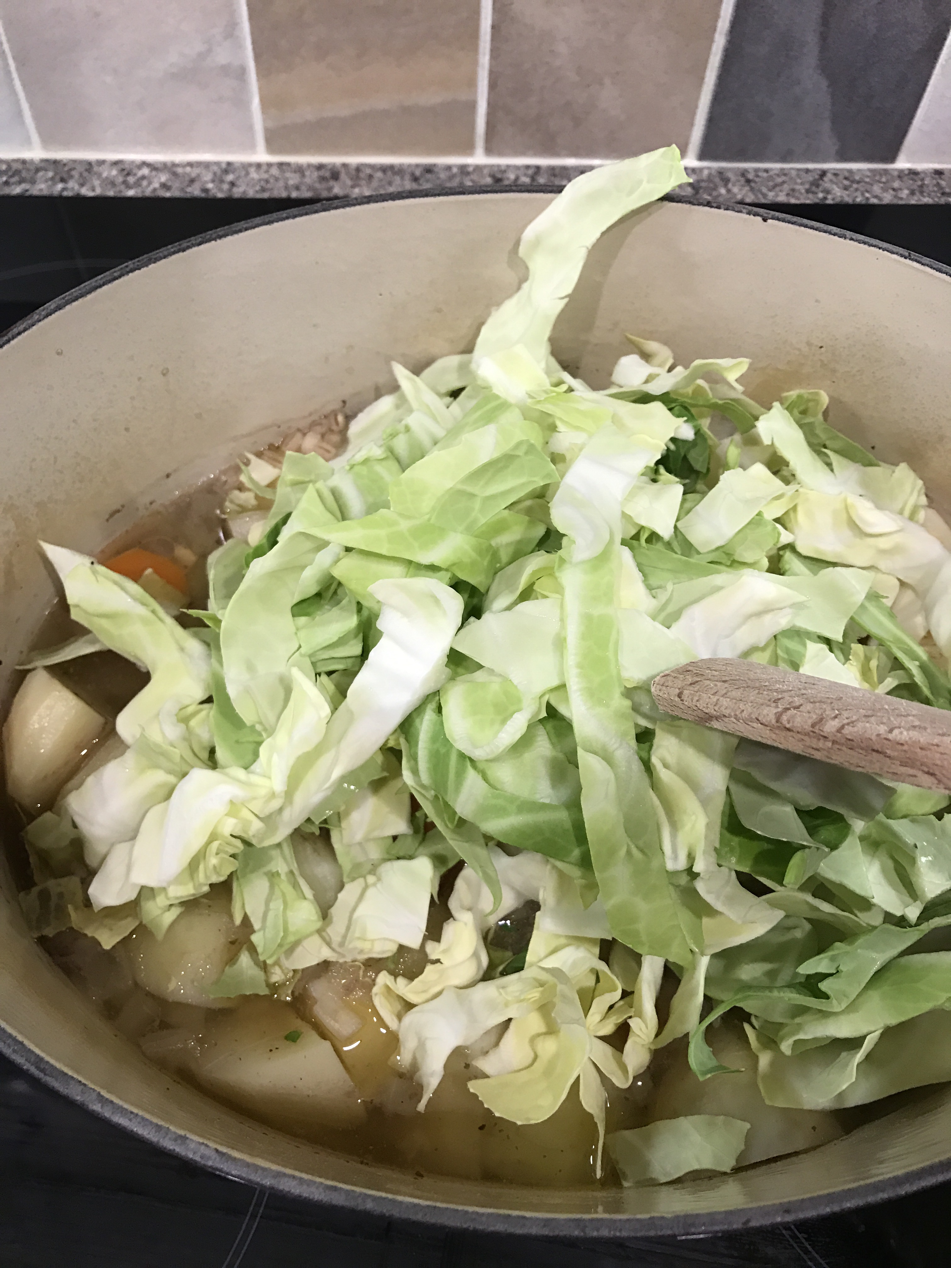 After an hour in the oven add the cabbage, stir in, replace the lid and put it back into the oven for another hour.