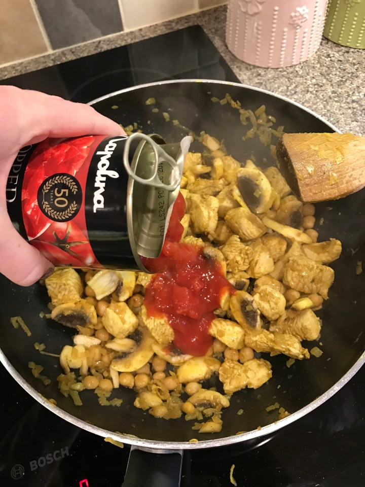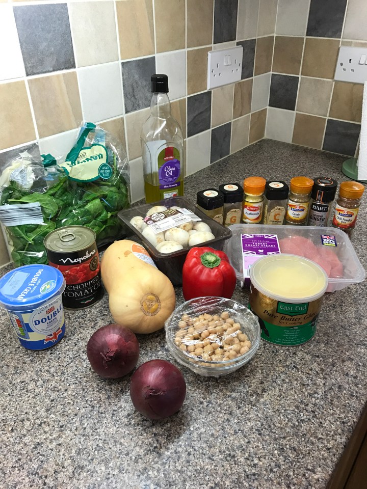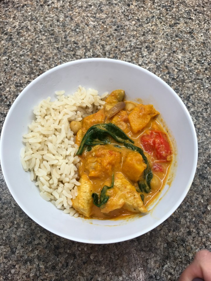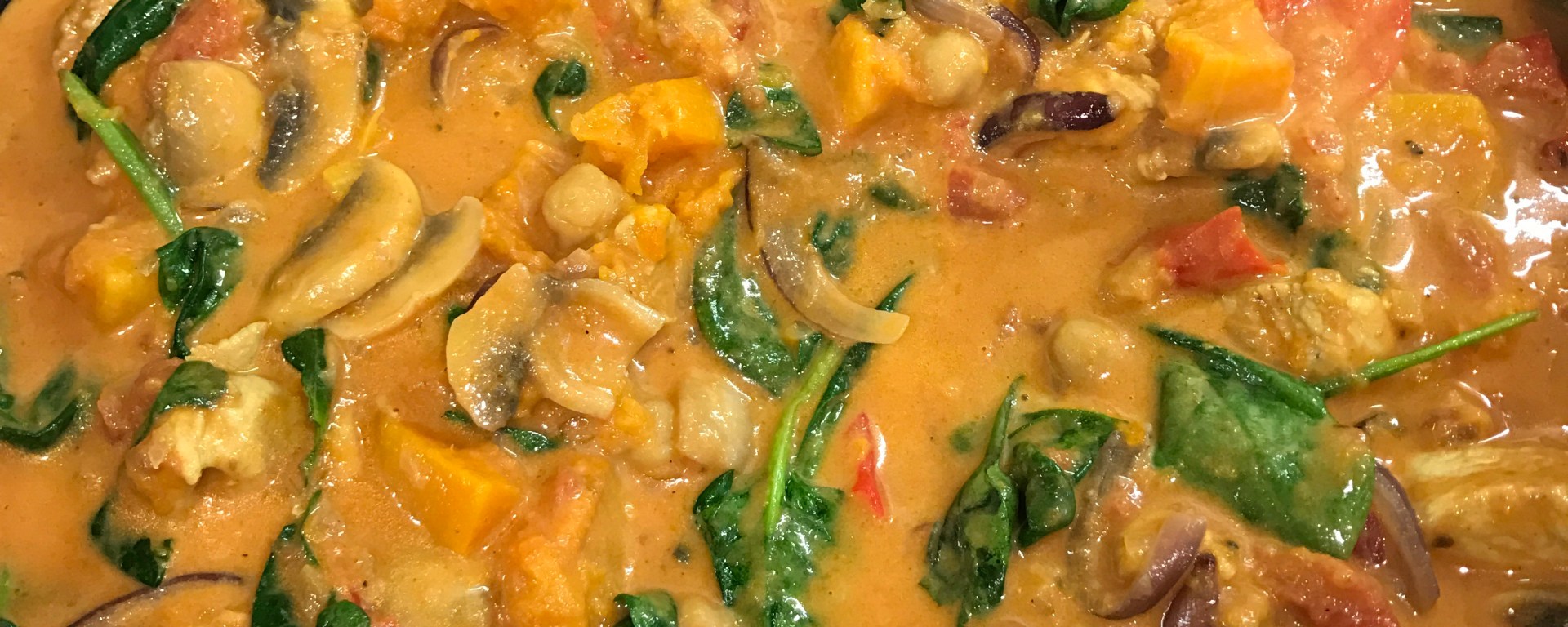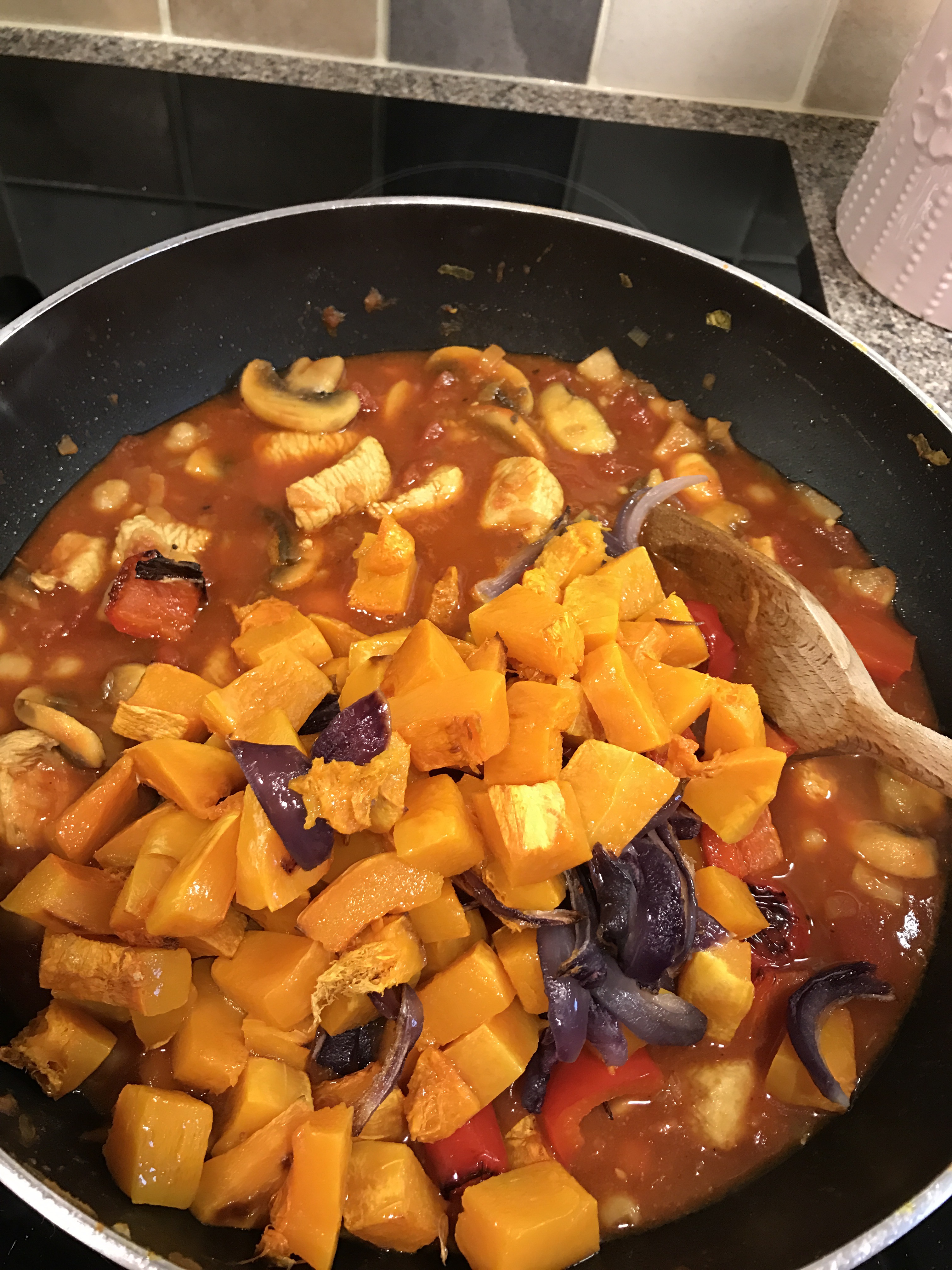 This is an incredibly mild but tasty curry packed with a variety of veg but centred around the butternut squash. I’ve added some turkey to it to please the husband who tends to moan if I feed him something without meat in it- but really this is a vegetarian dish and the meat doesn’t add much in my opinion!!