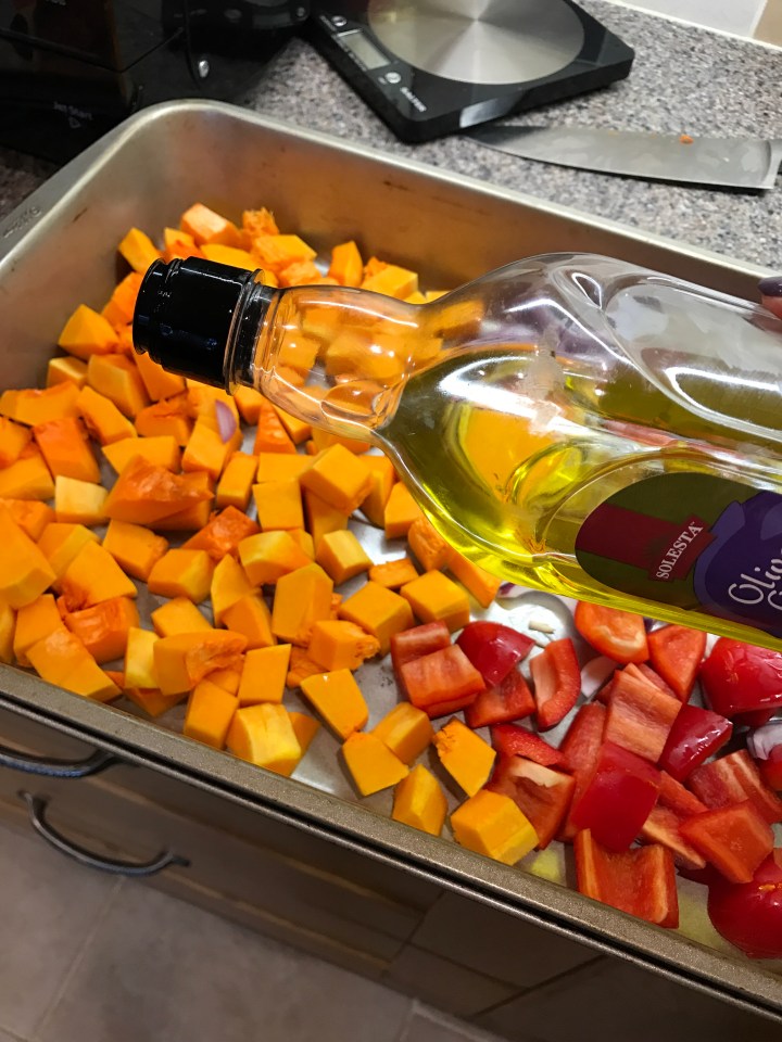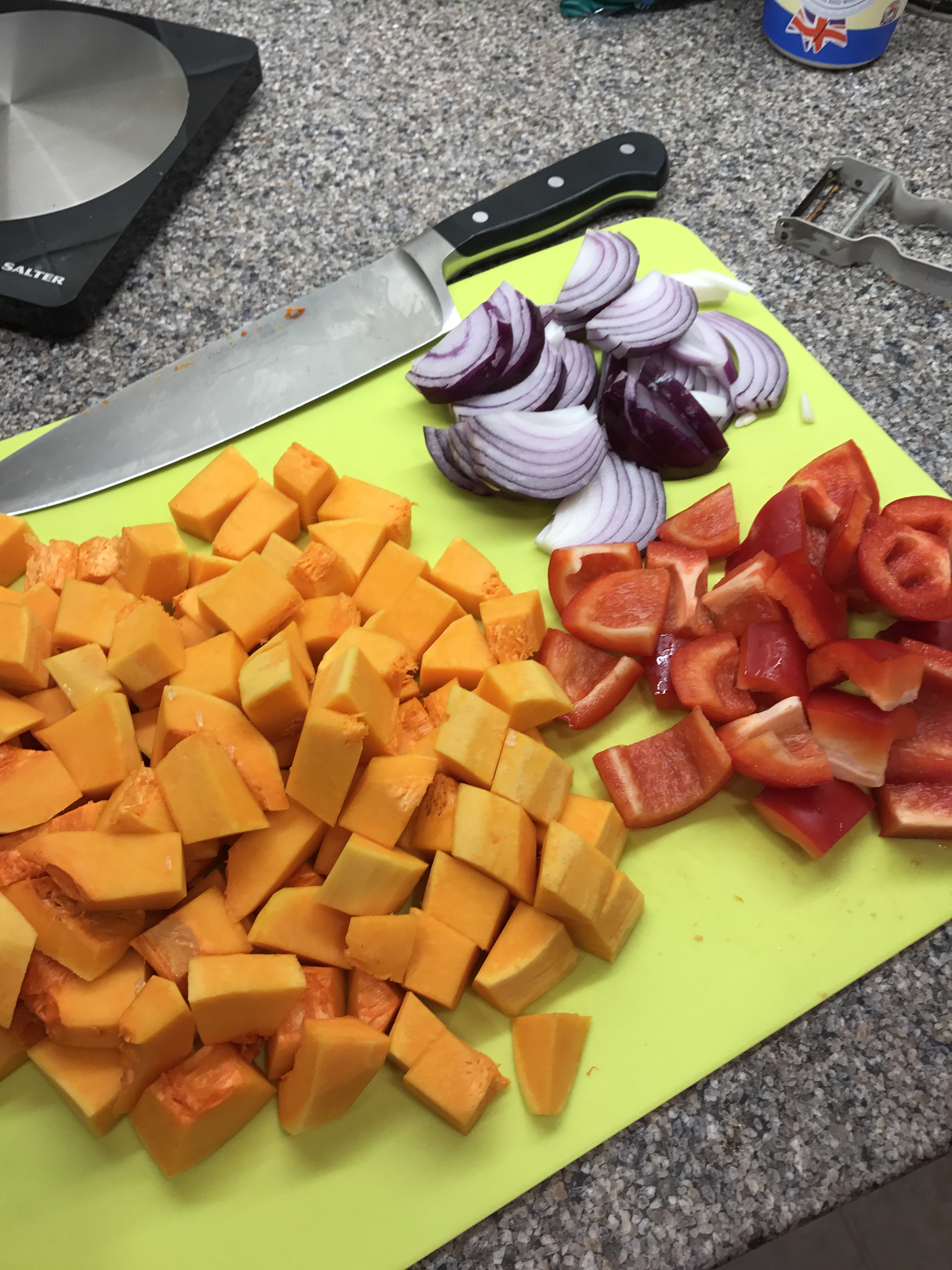 Peel and dice the butternut squash, peel and slice the red onion, cut the red pepper into chucks