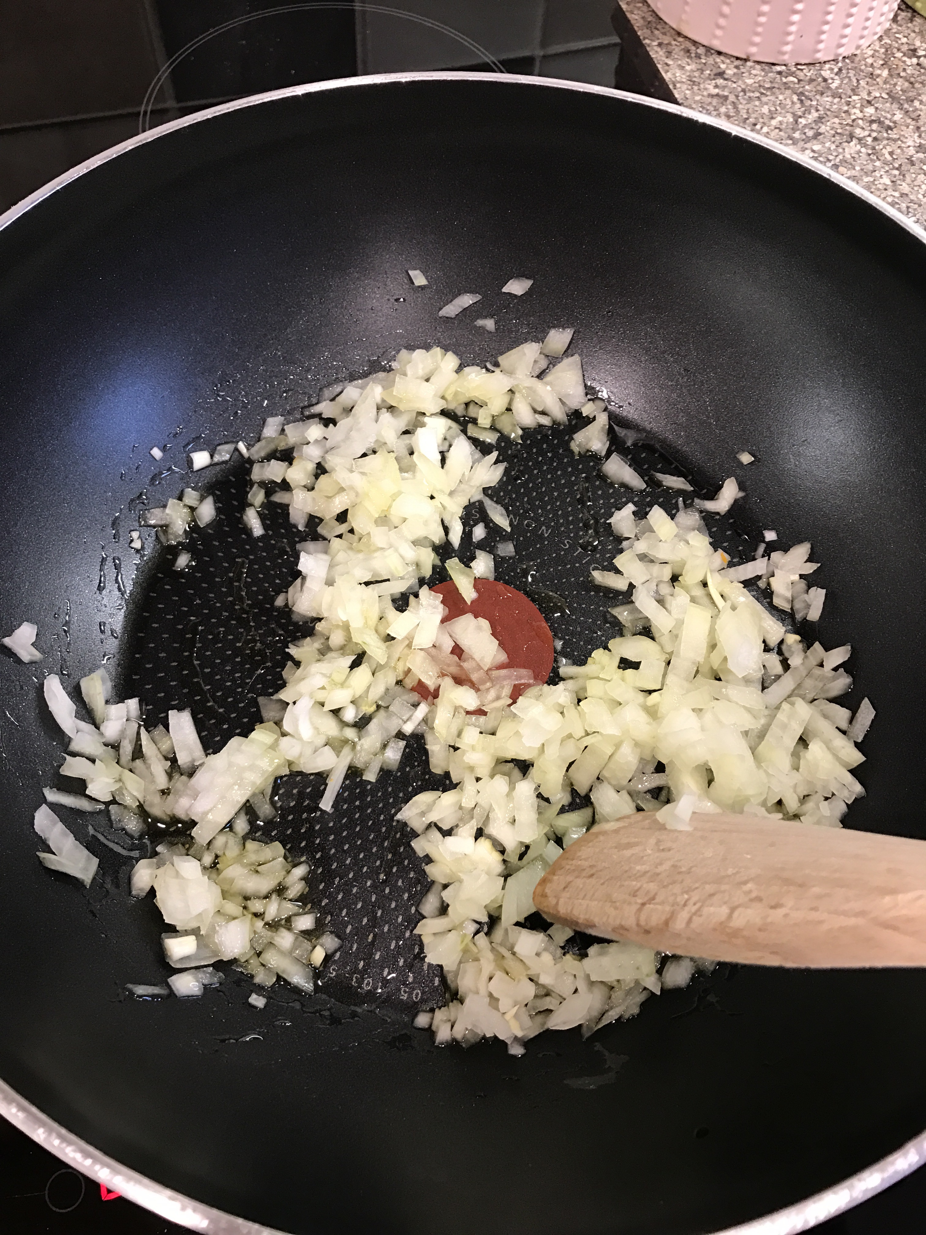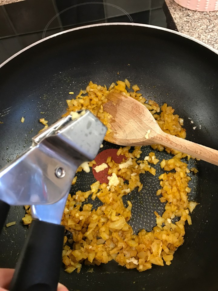 Meanwhile- finely chop the onion, peel the garlic and slice the onions