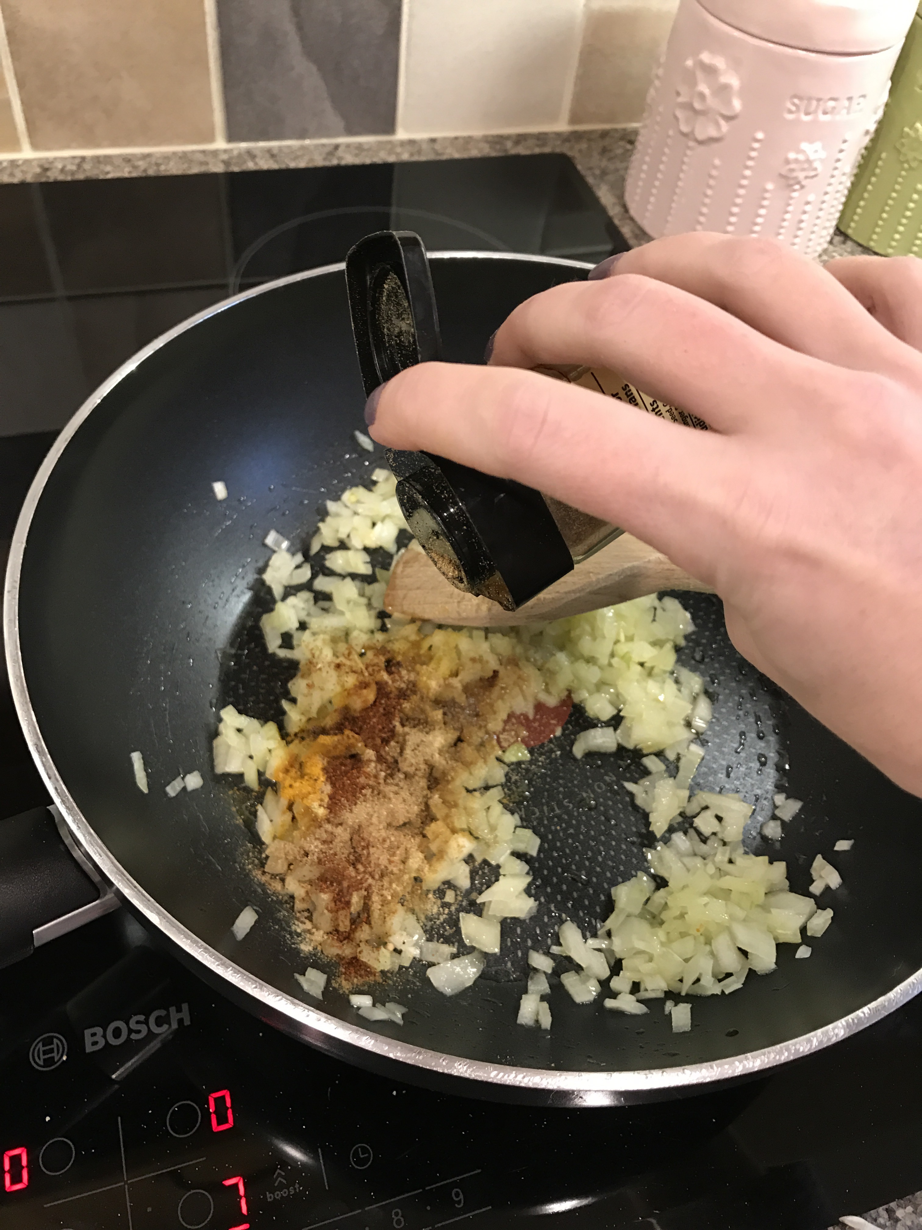 Add a teaspoon of each of the spices- chilli, cumin, coriander, ginger, asafoetida, turmeric, garam masala. If you want a stronger curry you can double the chilli, garam masala and cumin or add a tablespoon of curry powder.