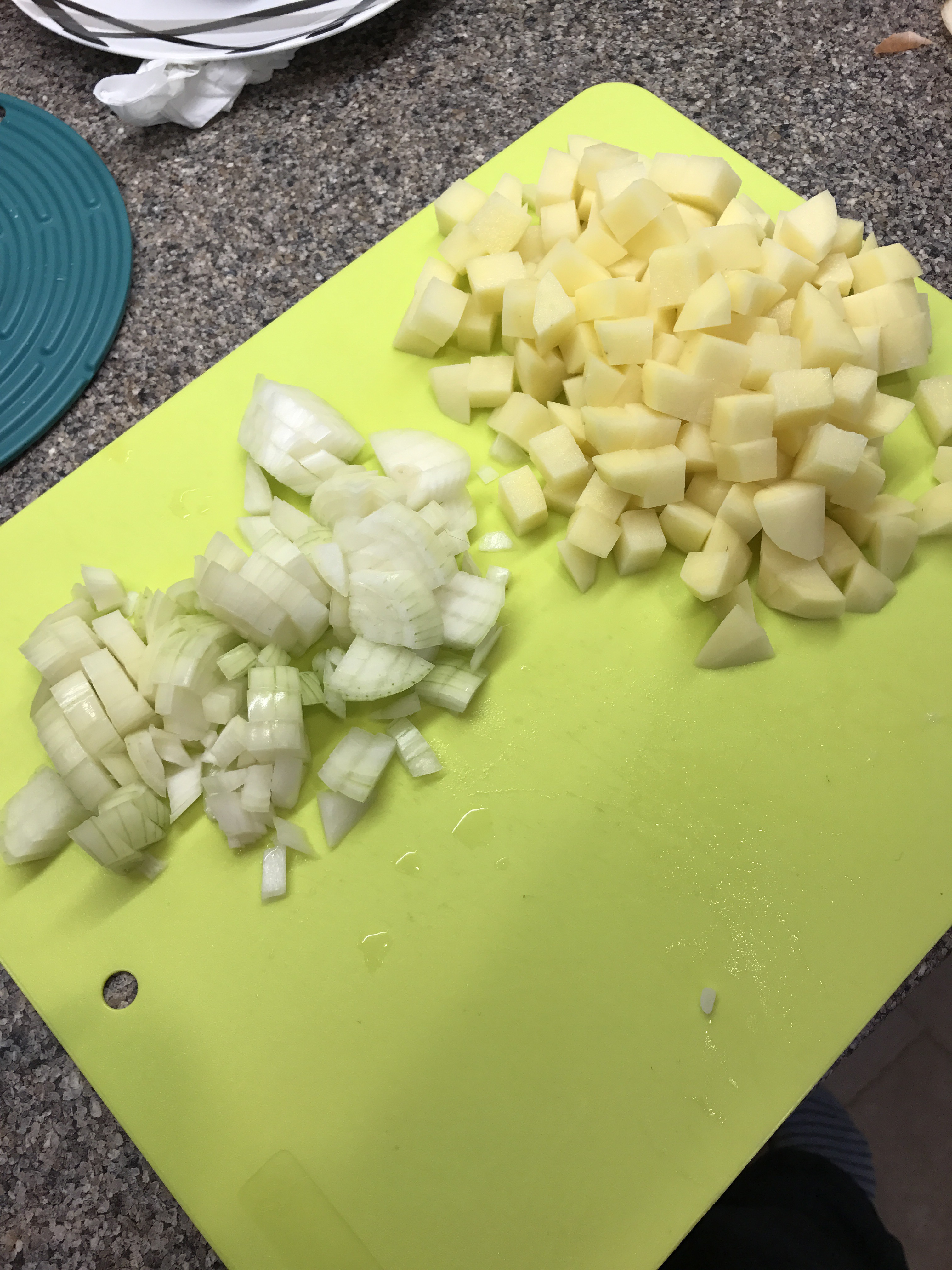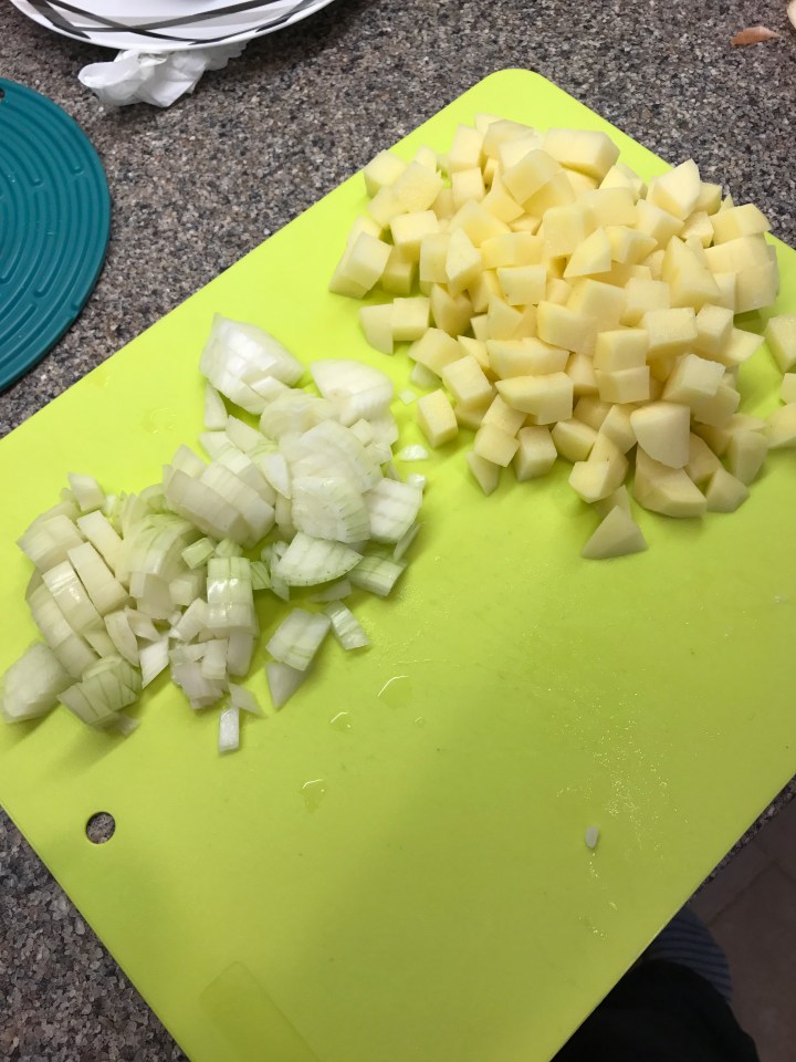 Roughly dice the onions. Peel the potatoes and chop into small cubes.
