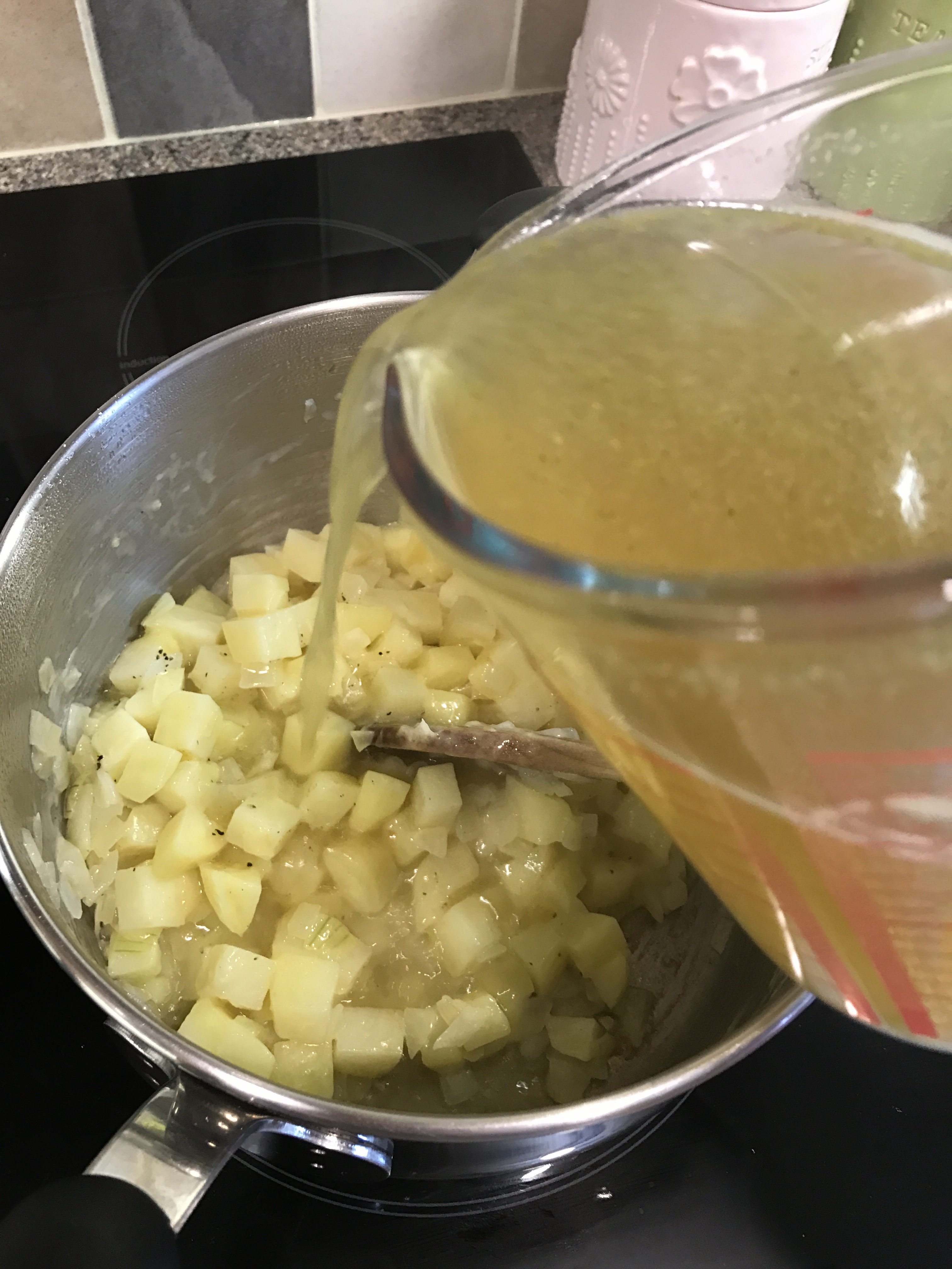 Add the onions and potatoes and cook on a medium-low heat for 10mins
