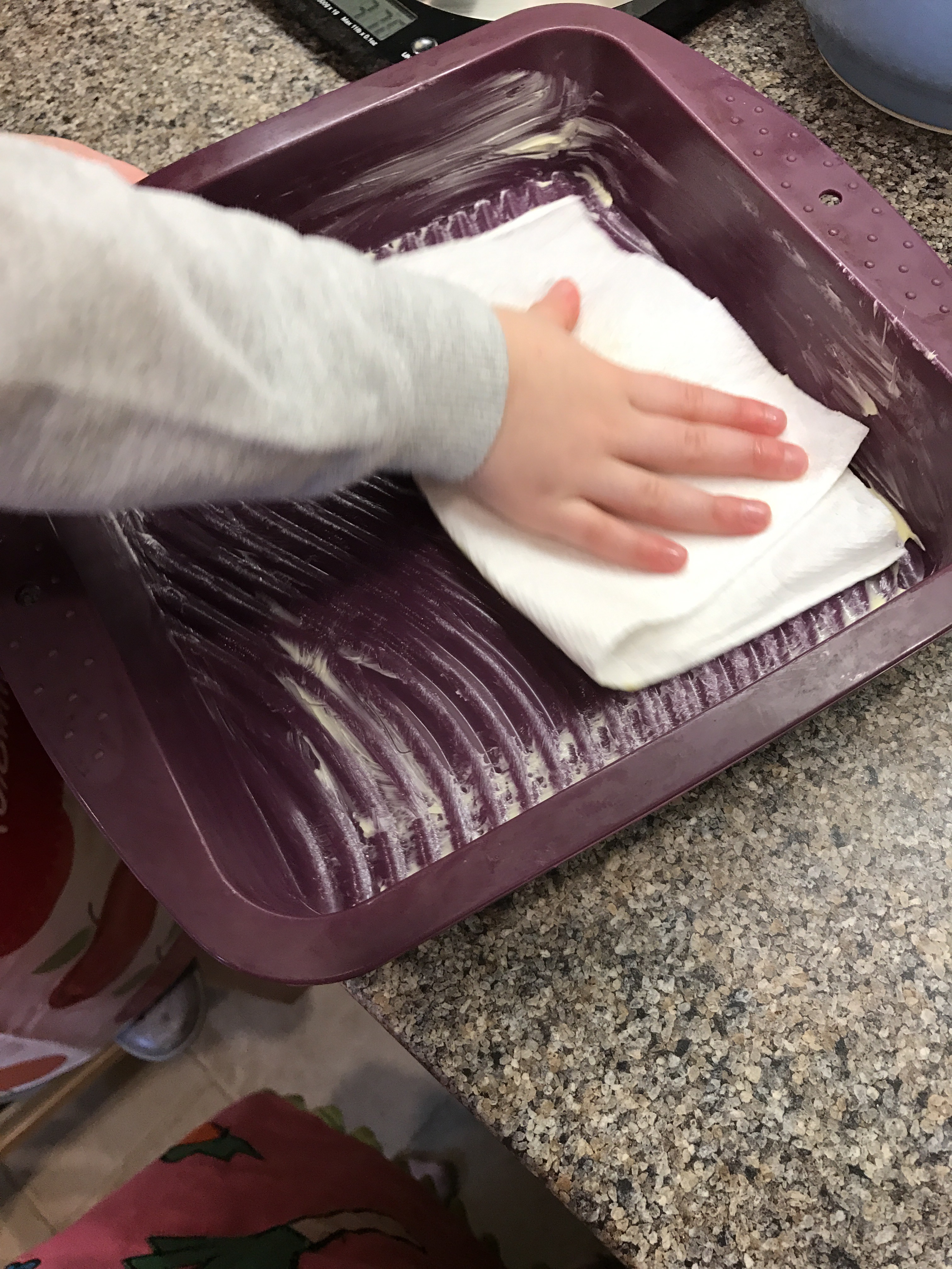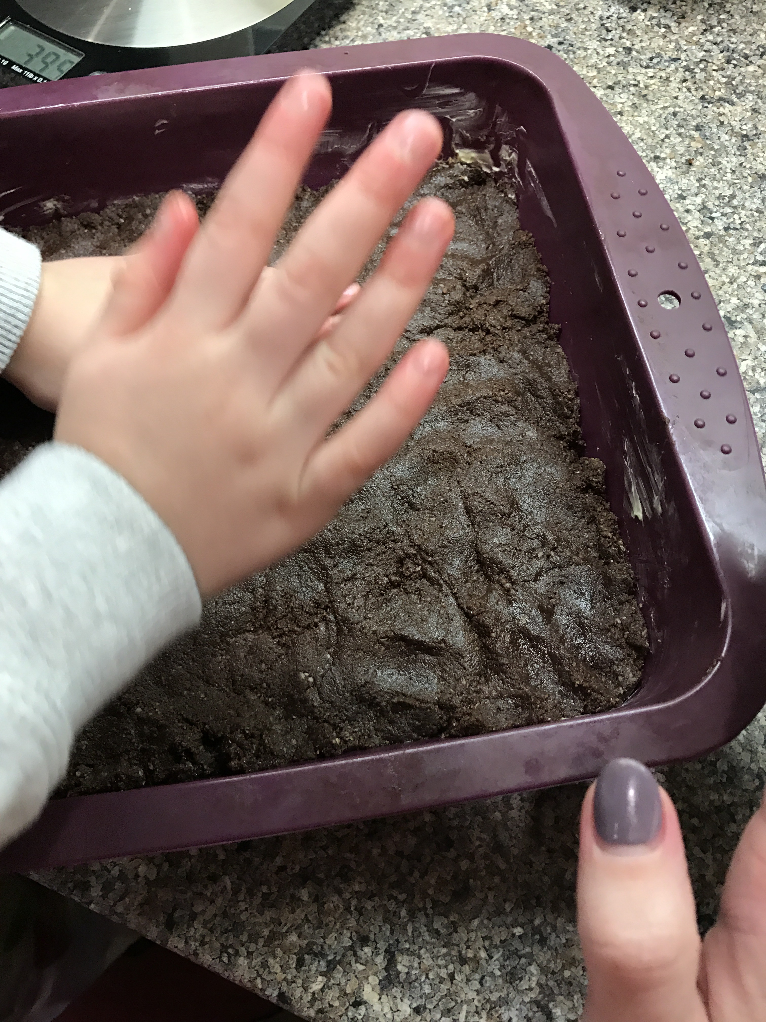 We found using our hands a lot easier for getting a more even Spread of the mixture!