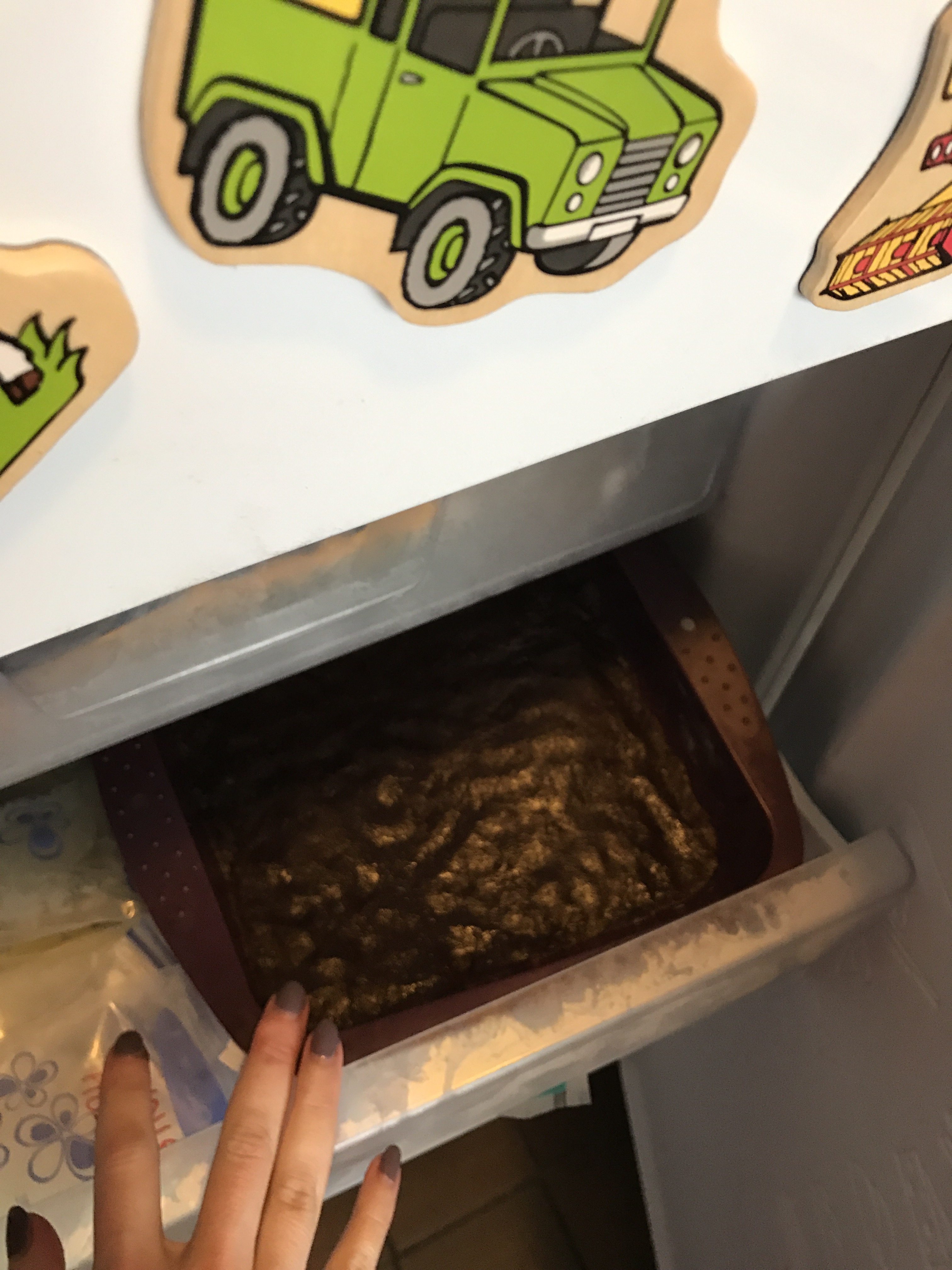 Put into the freezer while you make the next layer (it’ll firm up within 5mins or so)