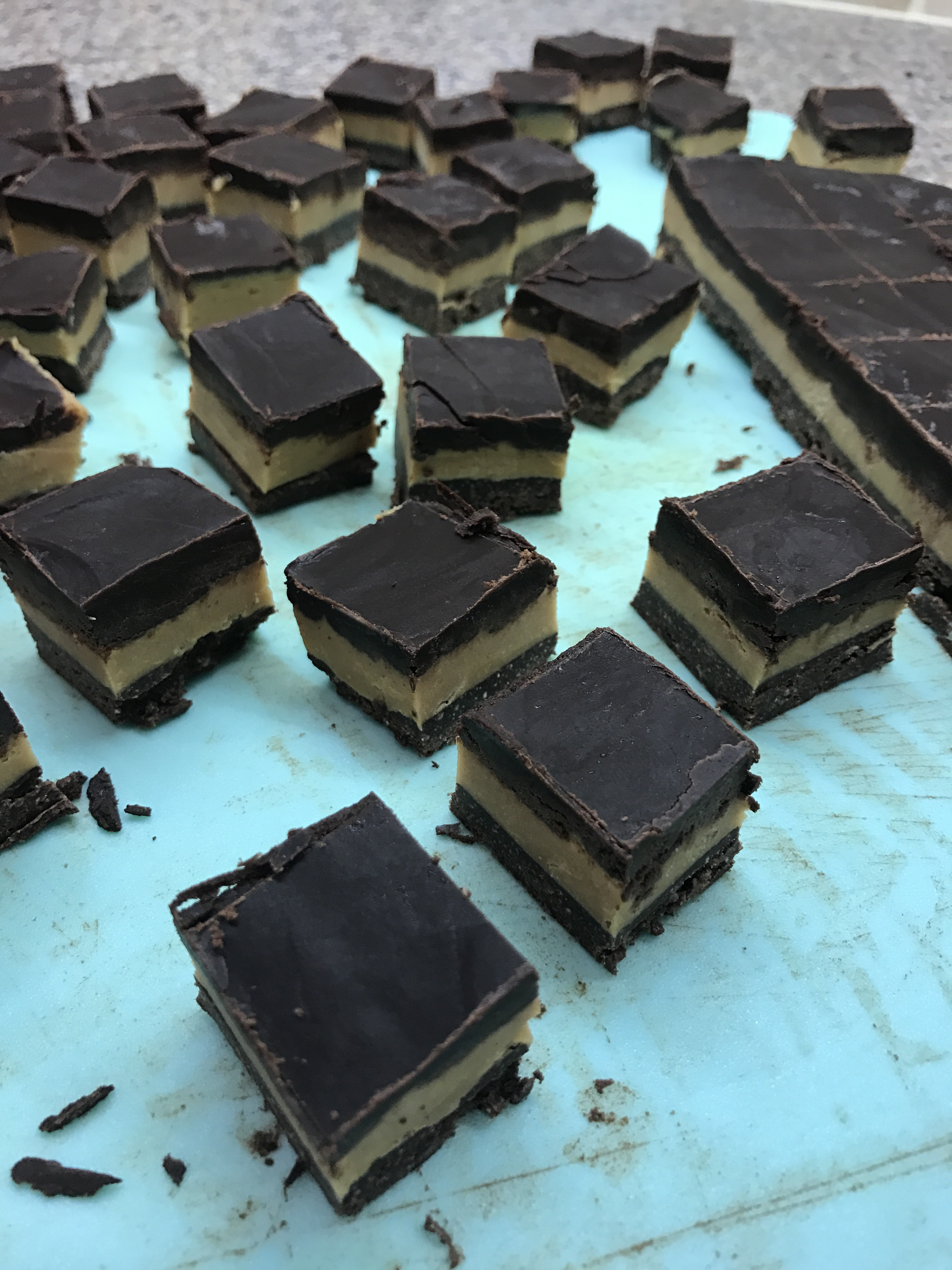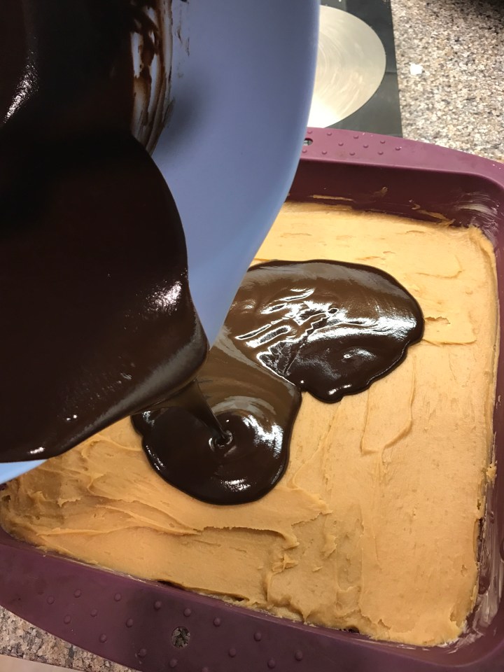 Get the tray out of the freezer and spread the peanut butter mixture over the first layer. Put back into the freezer to firm while you make the top layer!