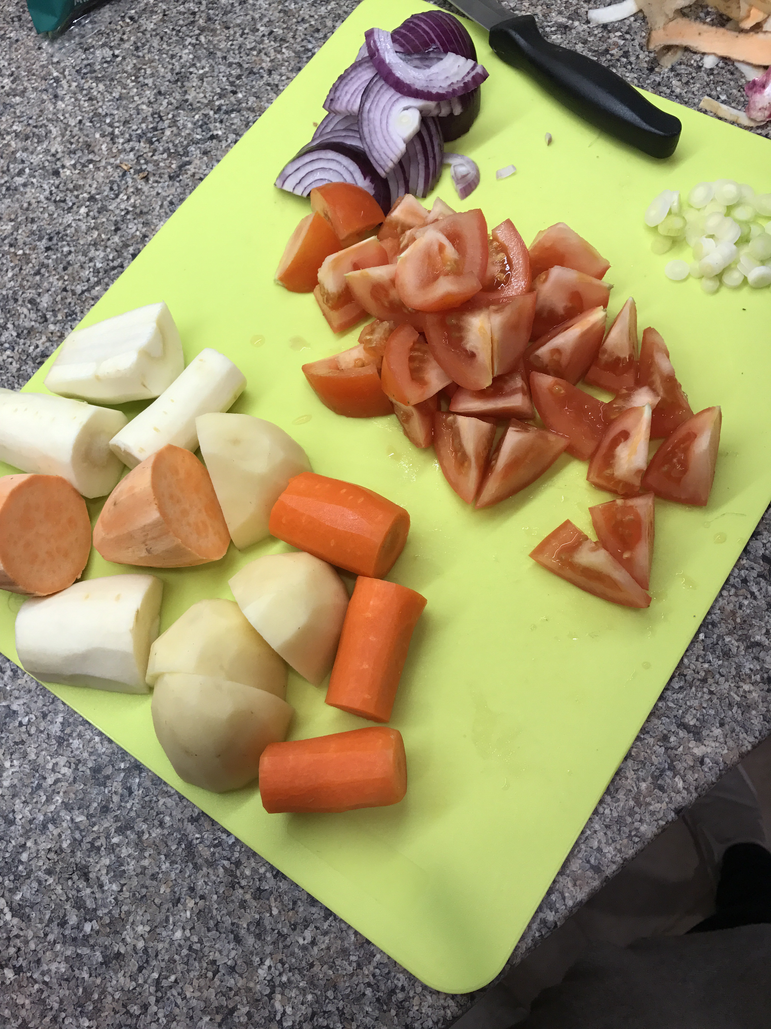 Peel the potato, sweet potato, parsnip and carrot and cut into large pieces. Chop each tomato into 16 pieces. Slice the red onion and spring onions.