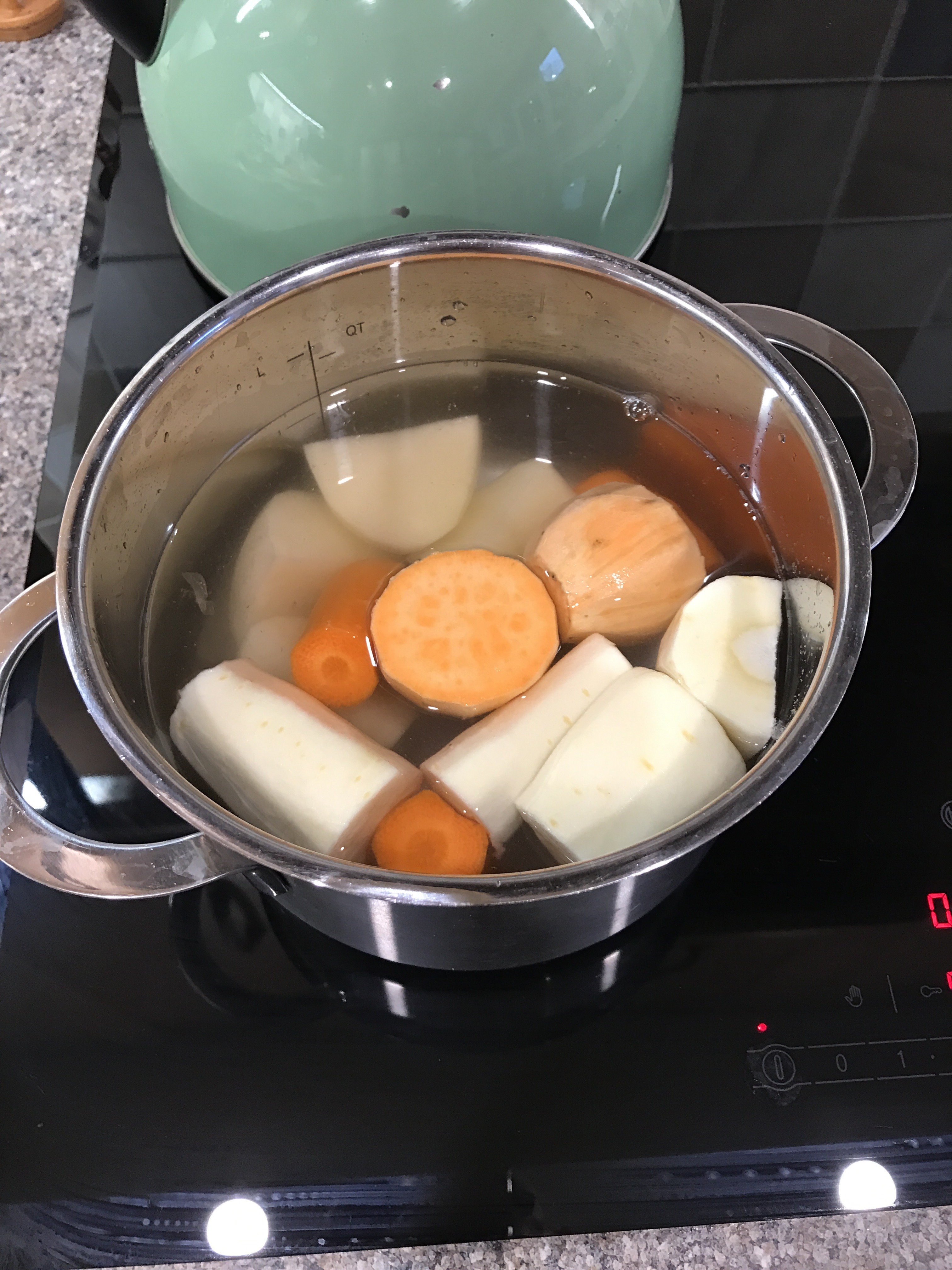 Put the potato, sweet potato, parsnip and carrot into a pan of cold water. Bring to the boil then simmer for 8-10mins