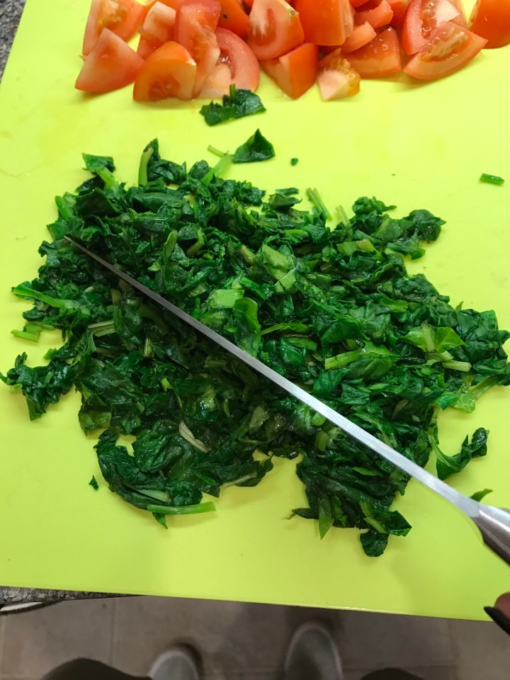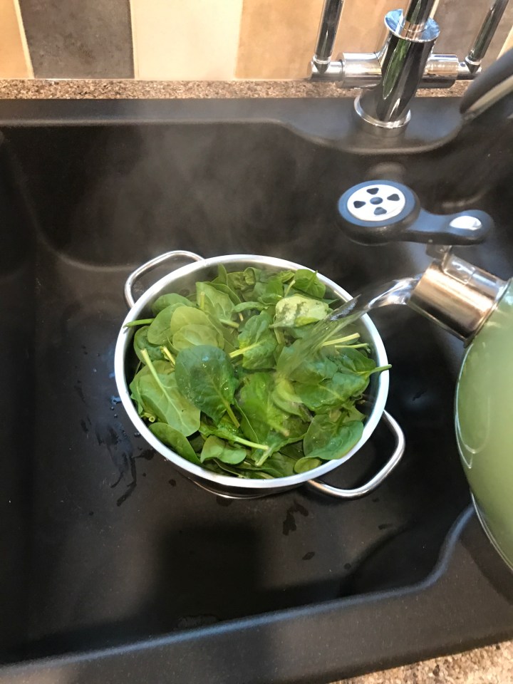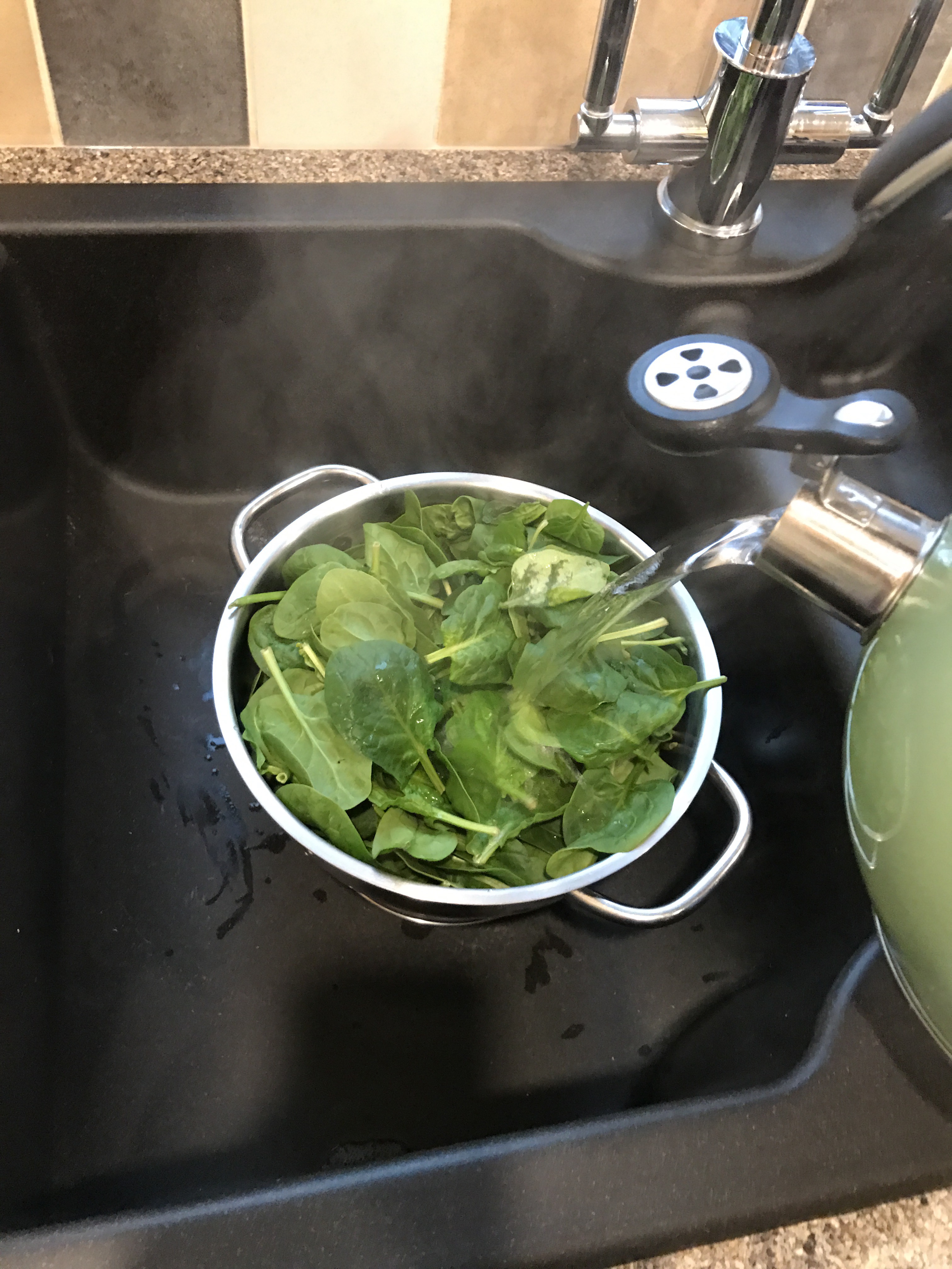Meanwhile put the spinach into a colander and pour a kettle full of boiling water over it to wilt it. Run cold water over it straight afterwards.