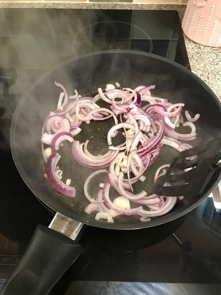 Heat a little oil in a frying pan and cook the red onion on a medium heat for 5-6mins.