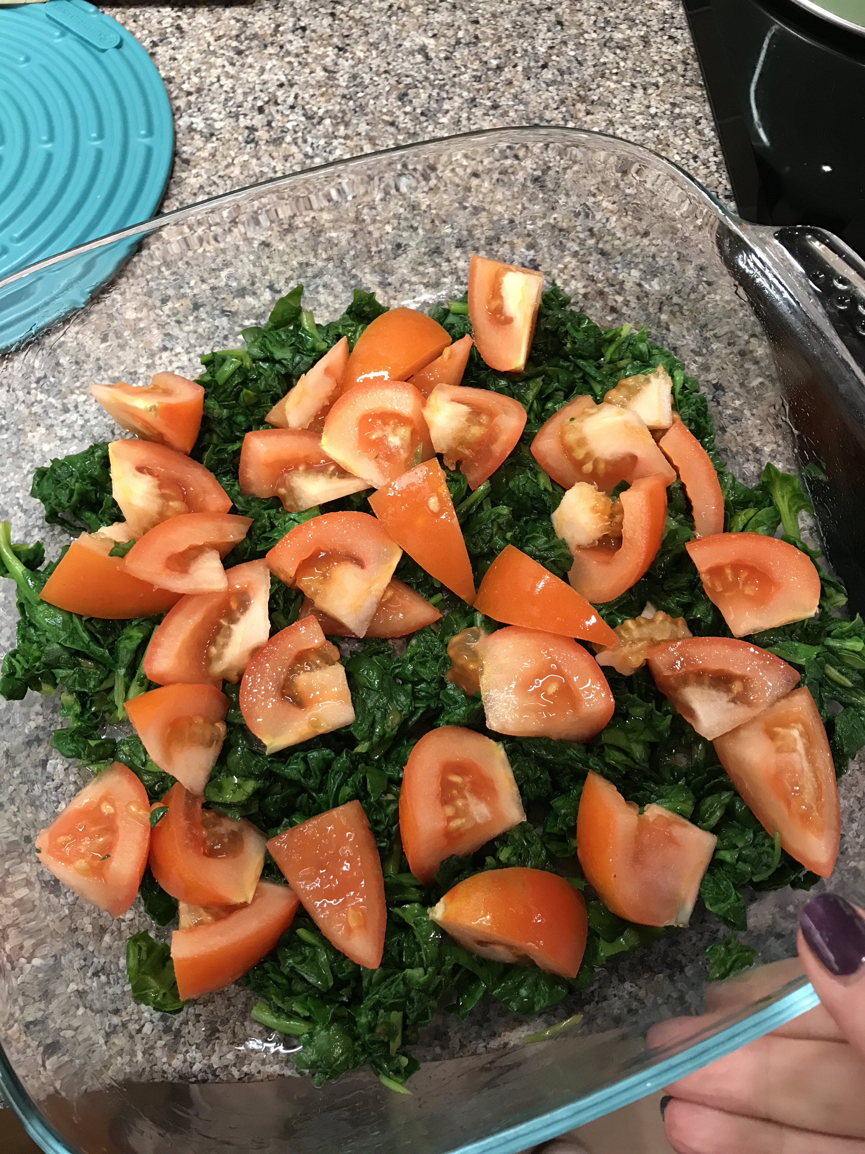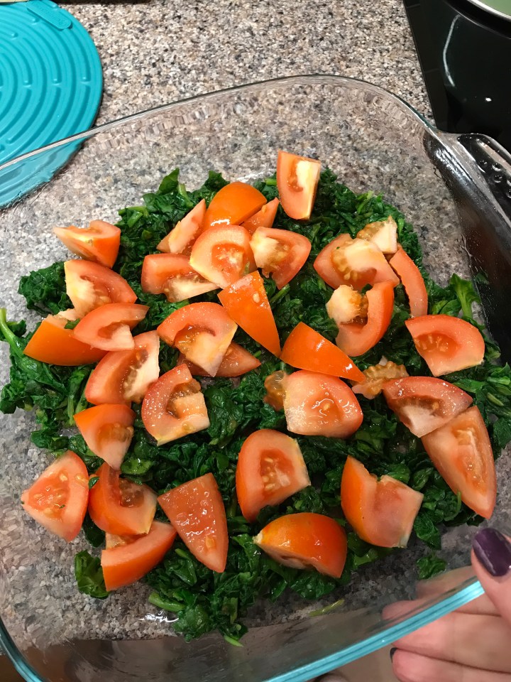 Grease a dish and layer the spinach and tomatoes on the bottom