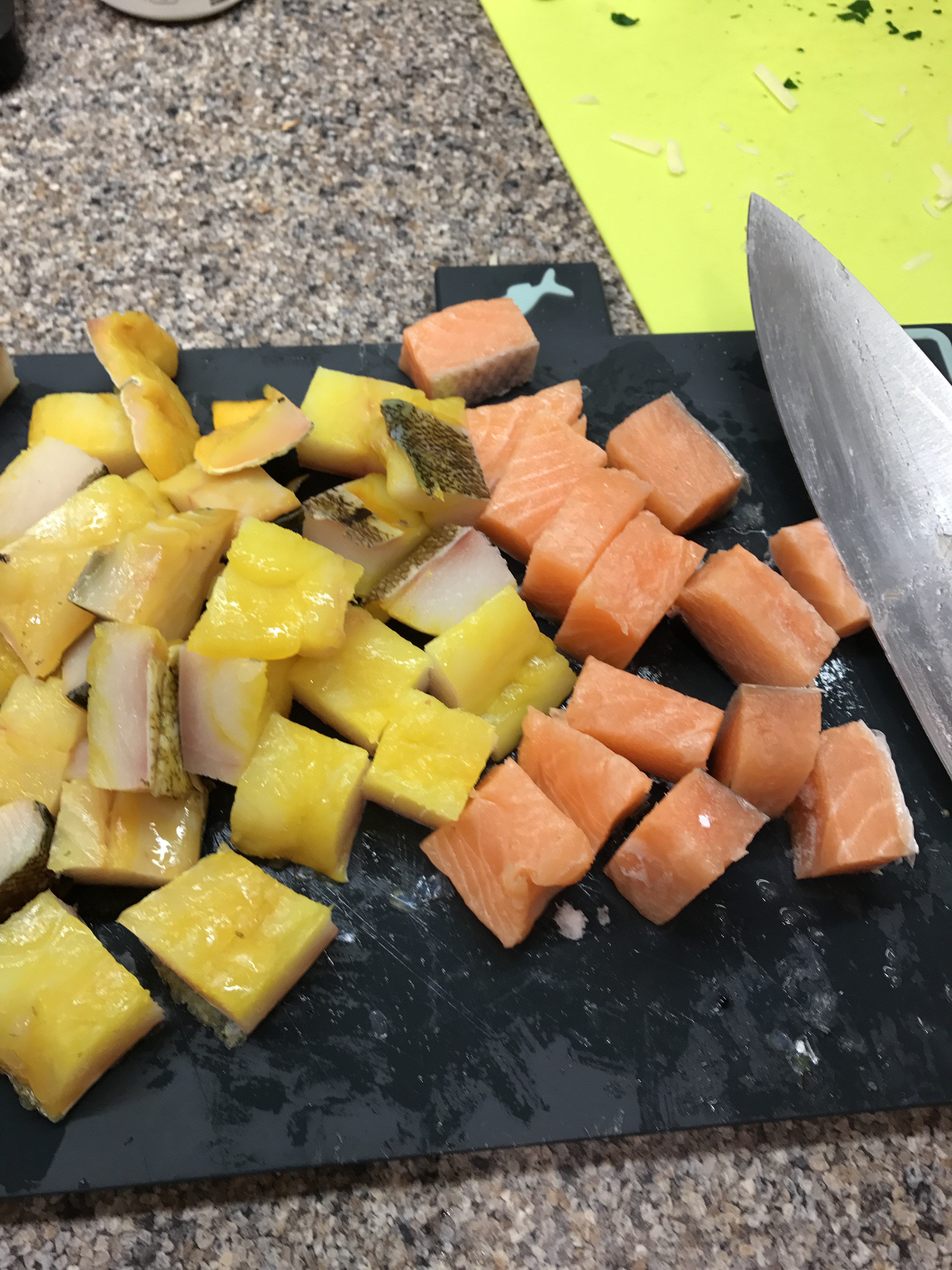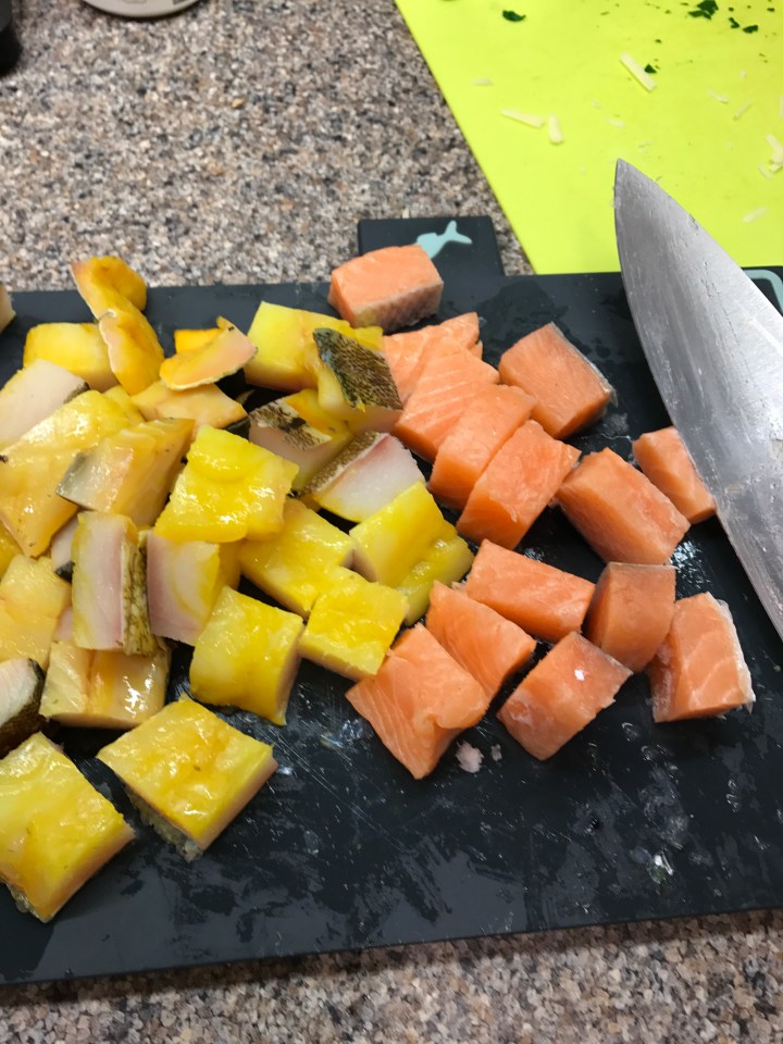 I was using frozen fish so I took it out of the freezer half an hour or so before I started cooking so it would thaw slightly. Cut into chunks- you can leave the skin on like I’ve done or remove it if you prefer.