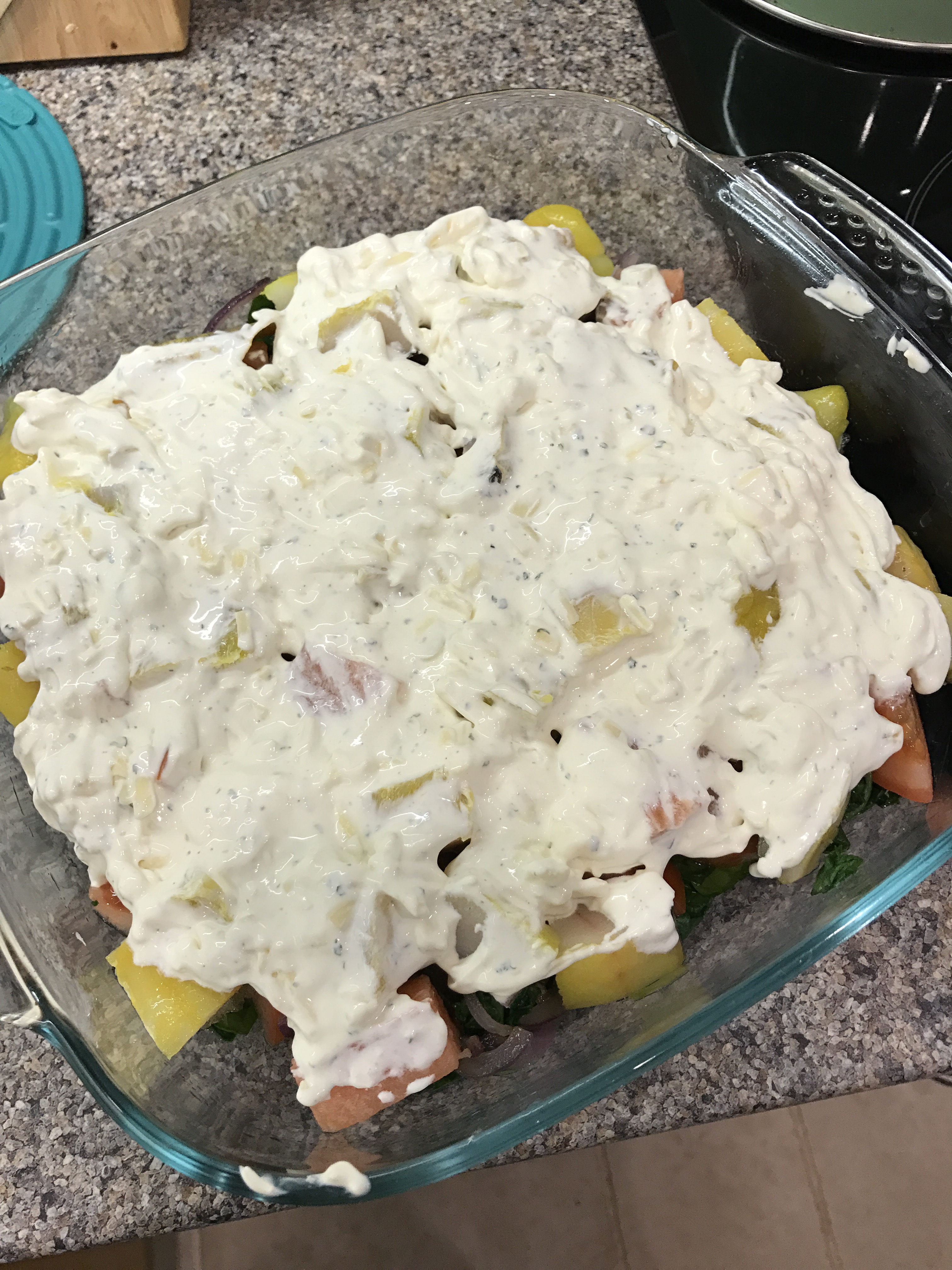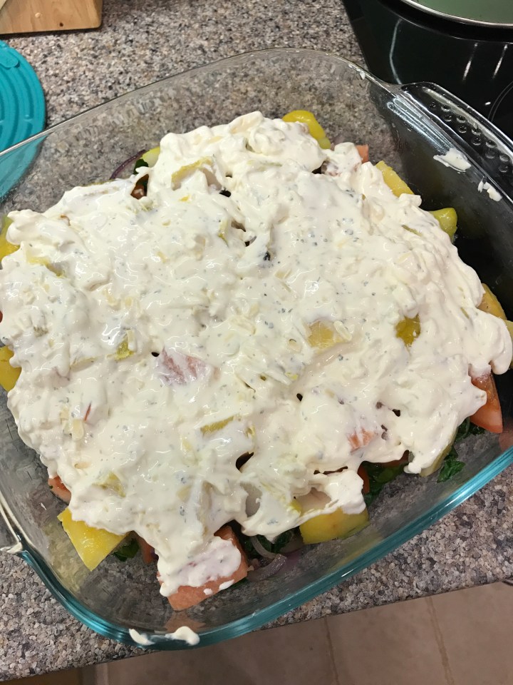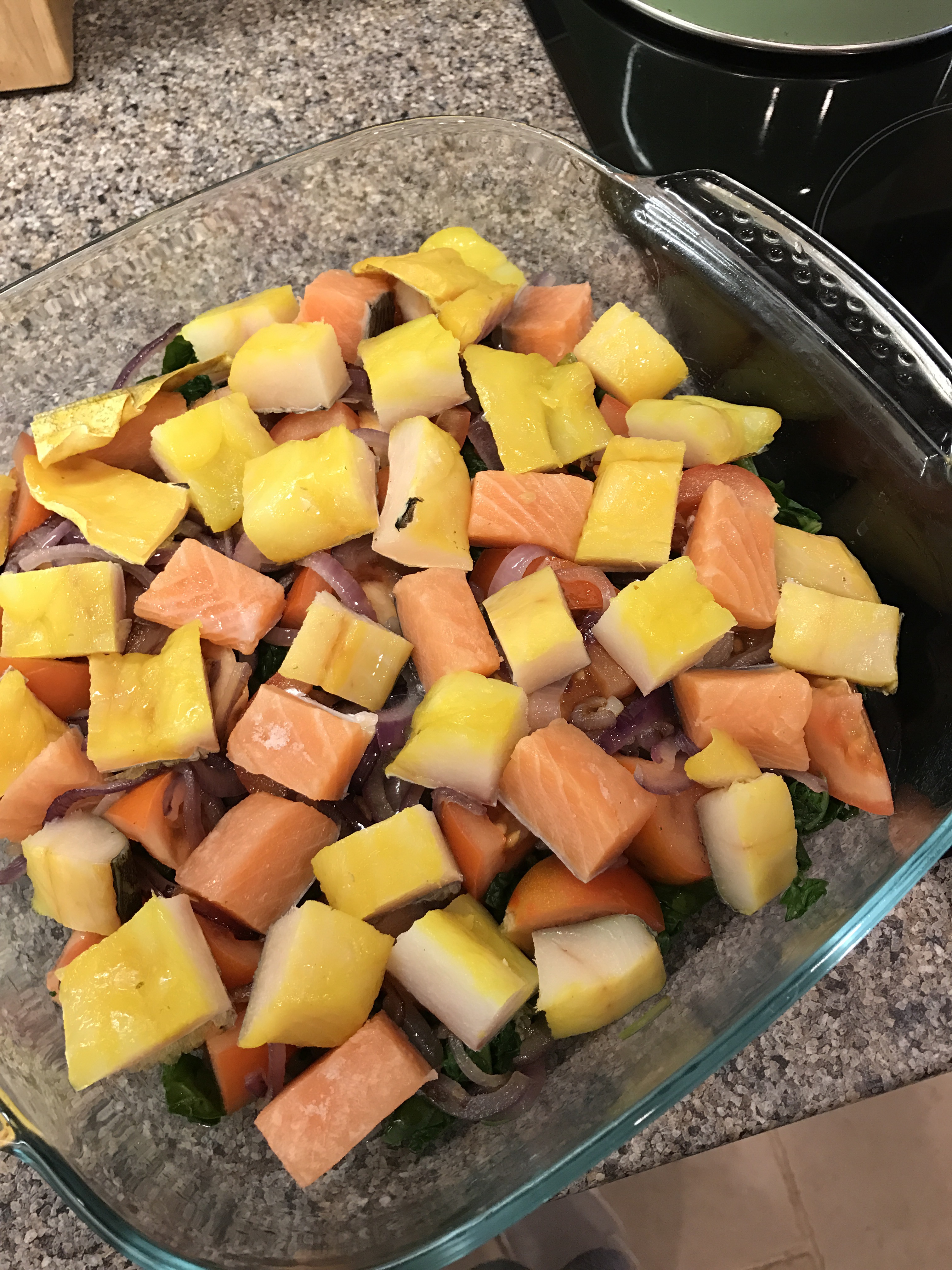 Arrange the veg on top then pop into the oven at 180 degrees for 40mins.
