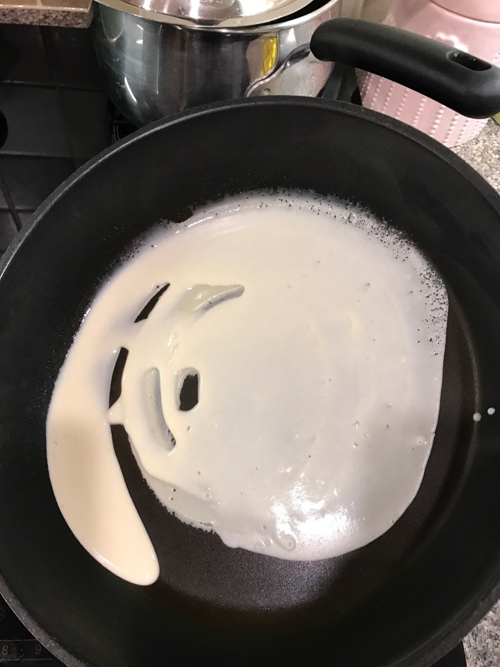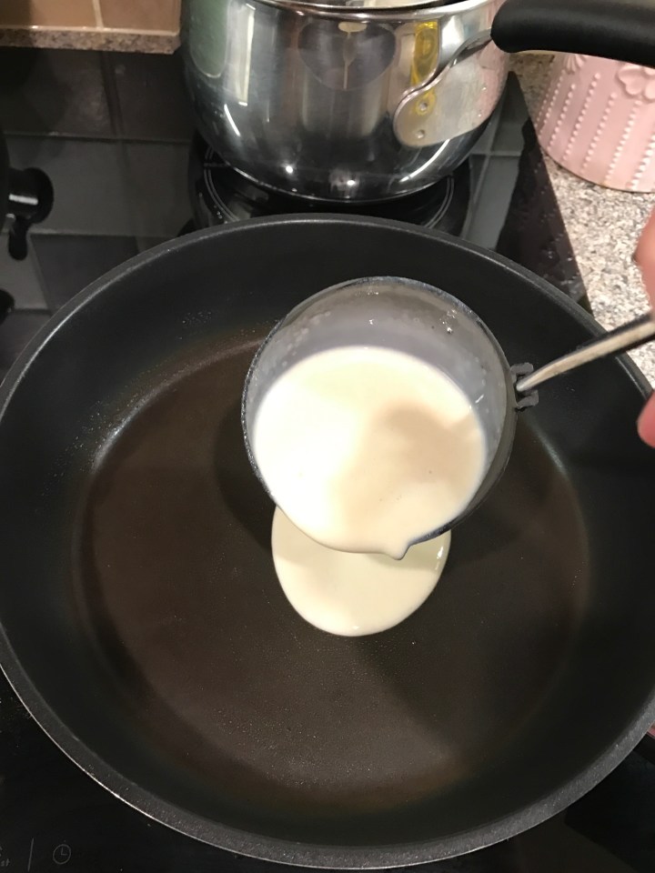 Tilt the pan to spread the mixture. Do this as quickly as you can otherwise it will start cooking and won’t spread!