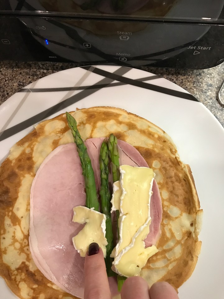 Now- I couldn’t decide on just one filling so I’ve done 3! Red pepper, feta and rocket. Mushroom, spinach and Gorgonzola. Asparagus, ham and Brie.
