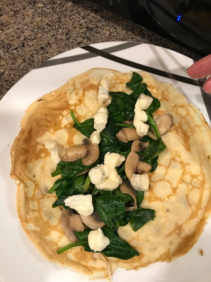 Spoon the mushrooms and spinach into a pancake