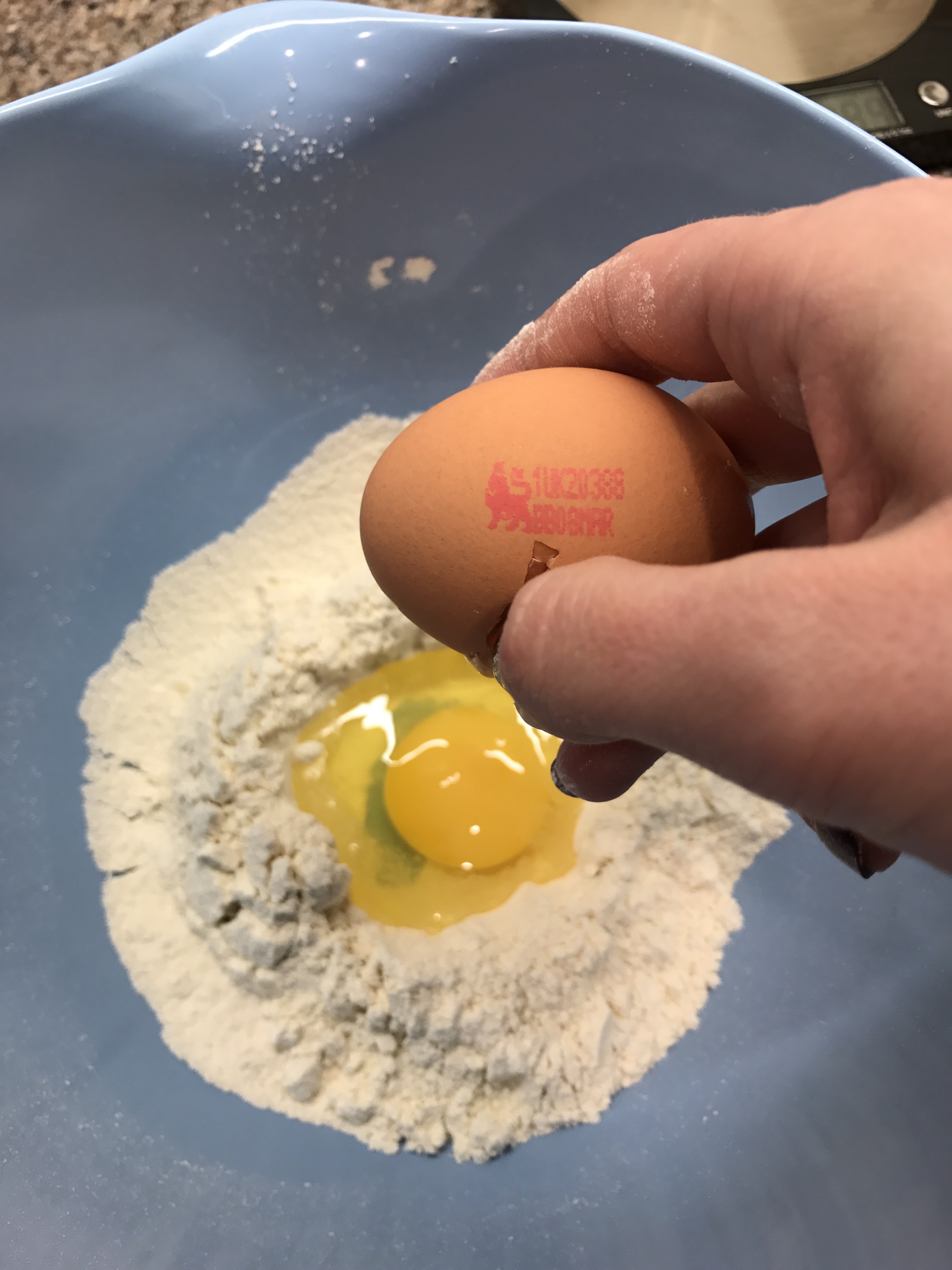 Make a hole in the middle of the flour and crack the eggs into it