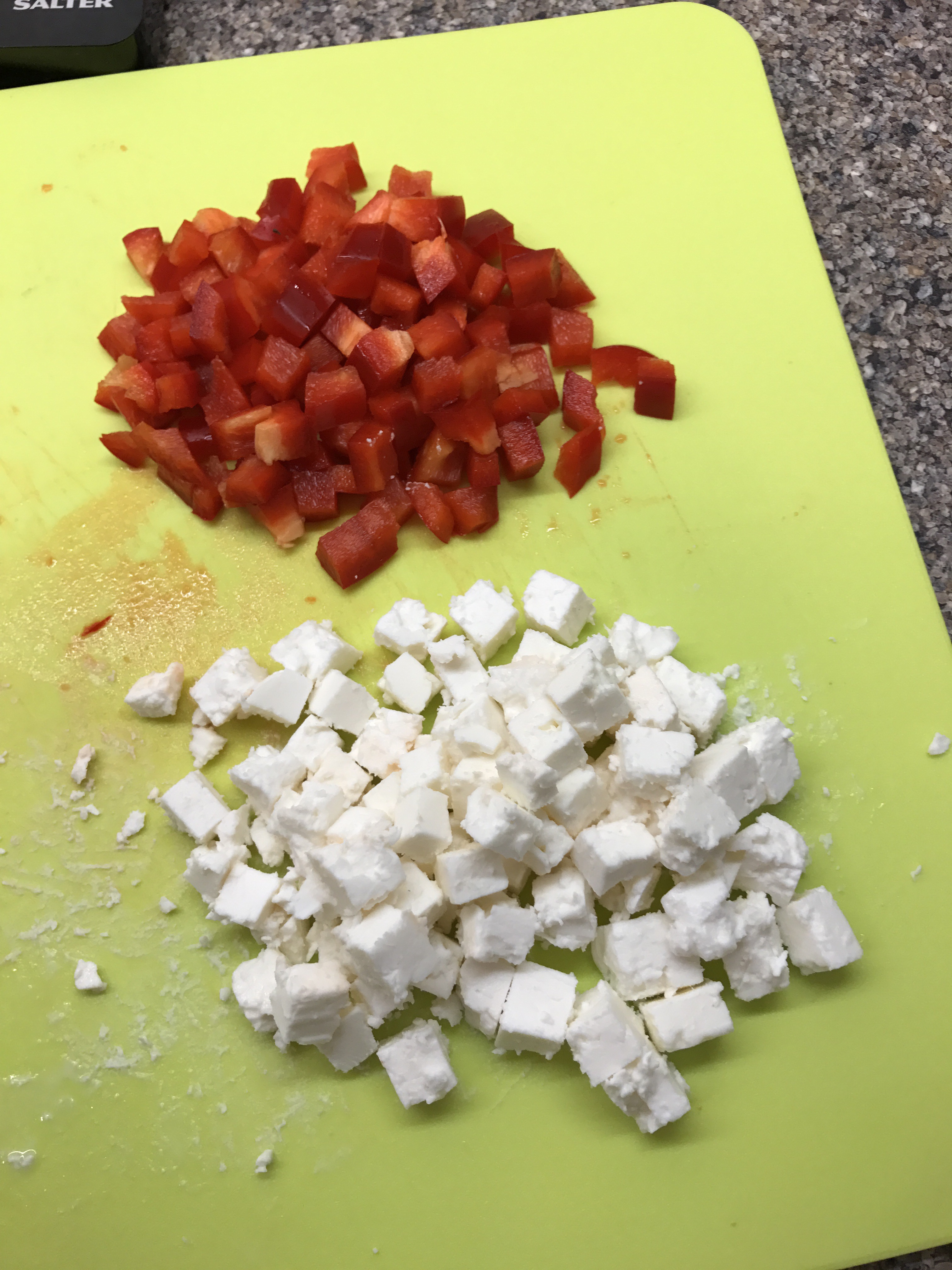 Cut the cheese and pepper into cubes