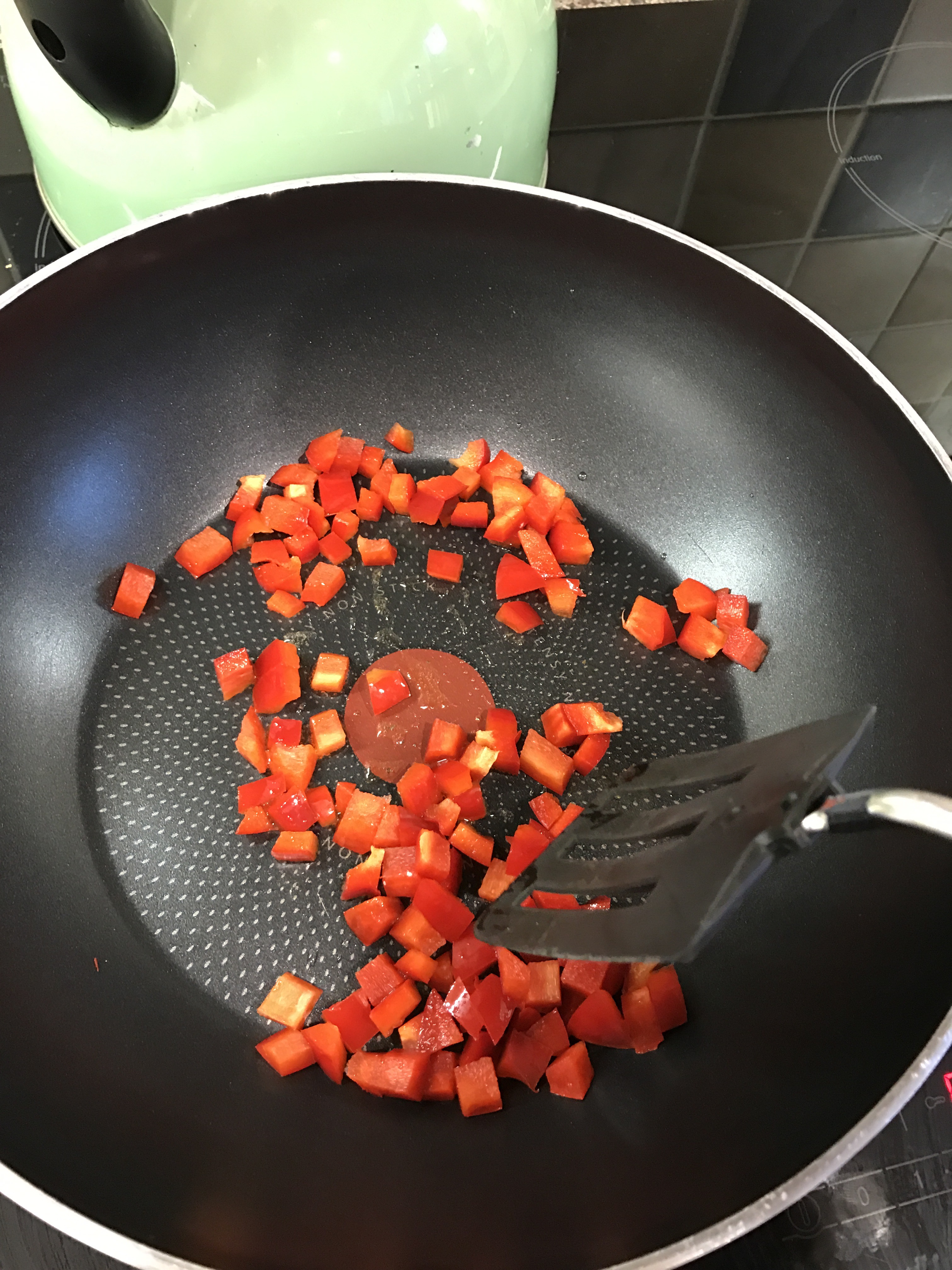 Cook the pepper in a little olive oil on a medium heat until soft (around 8mins)