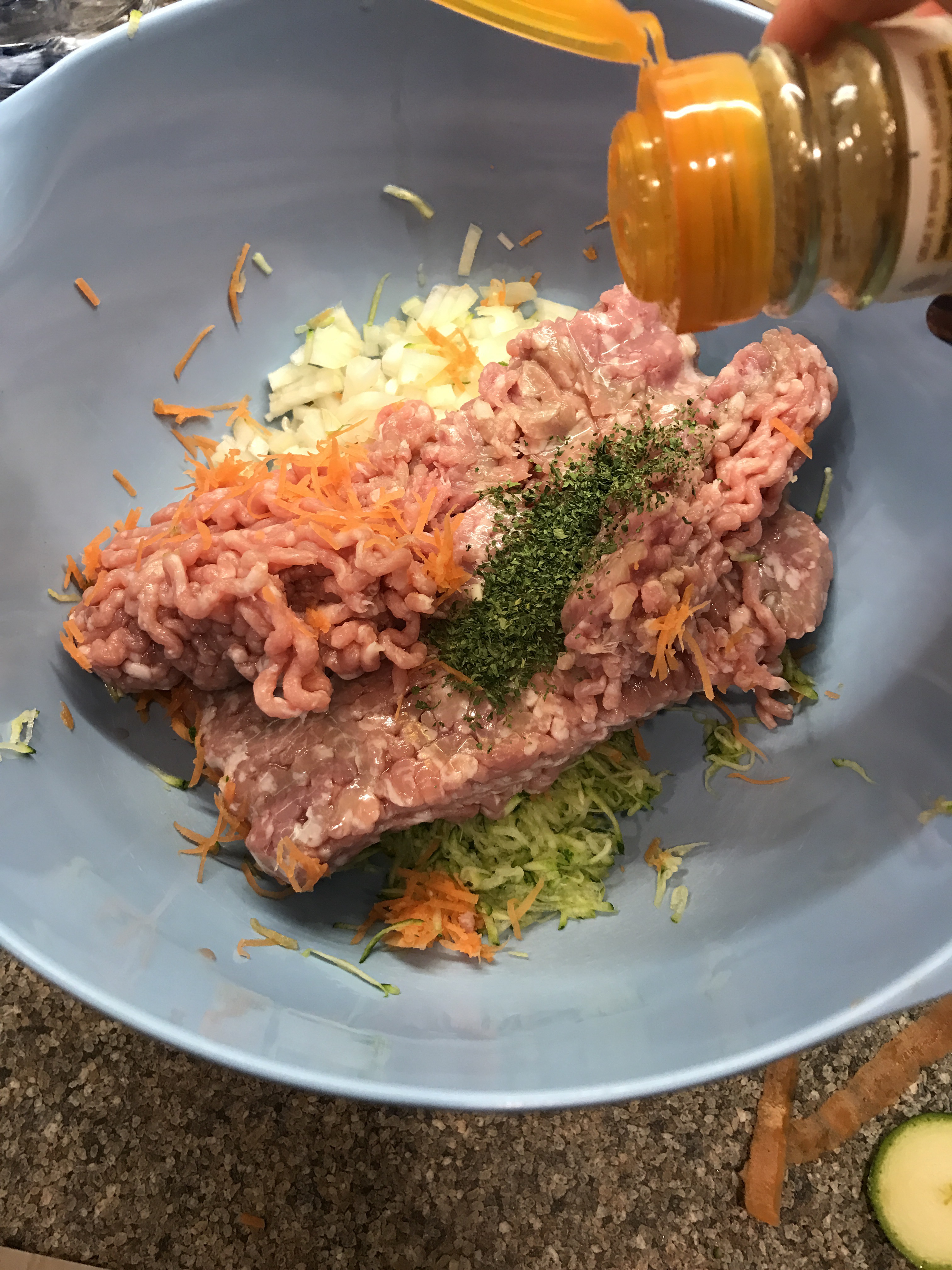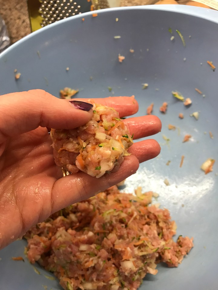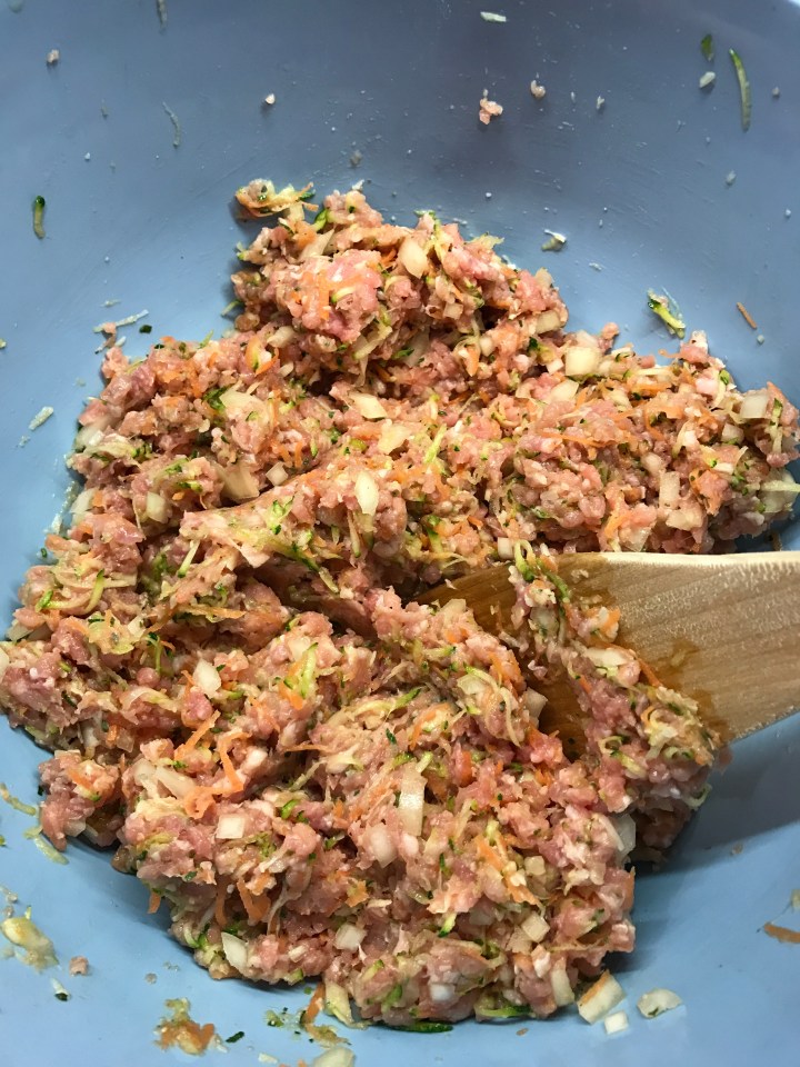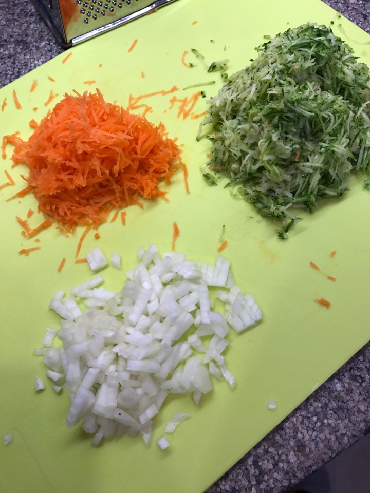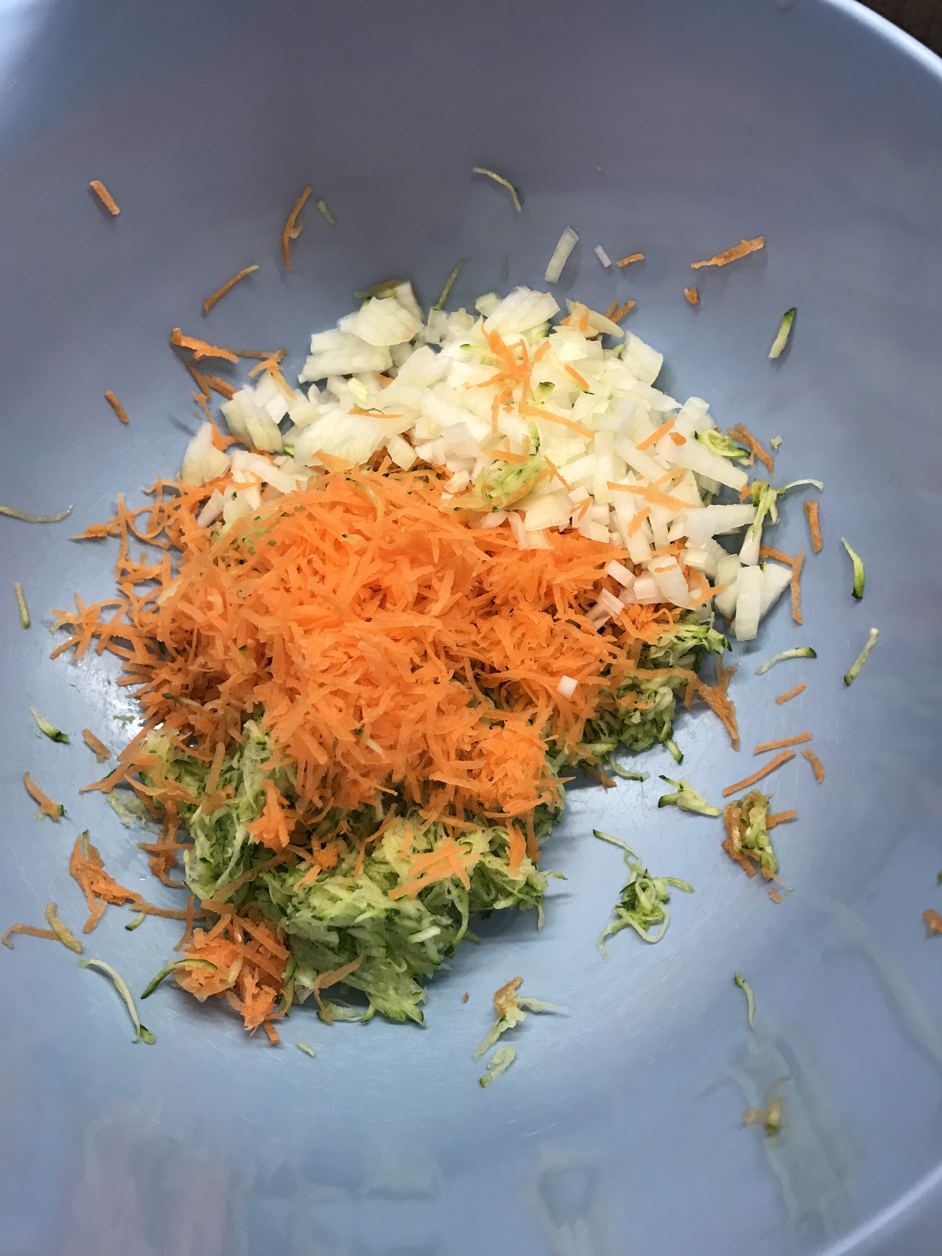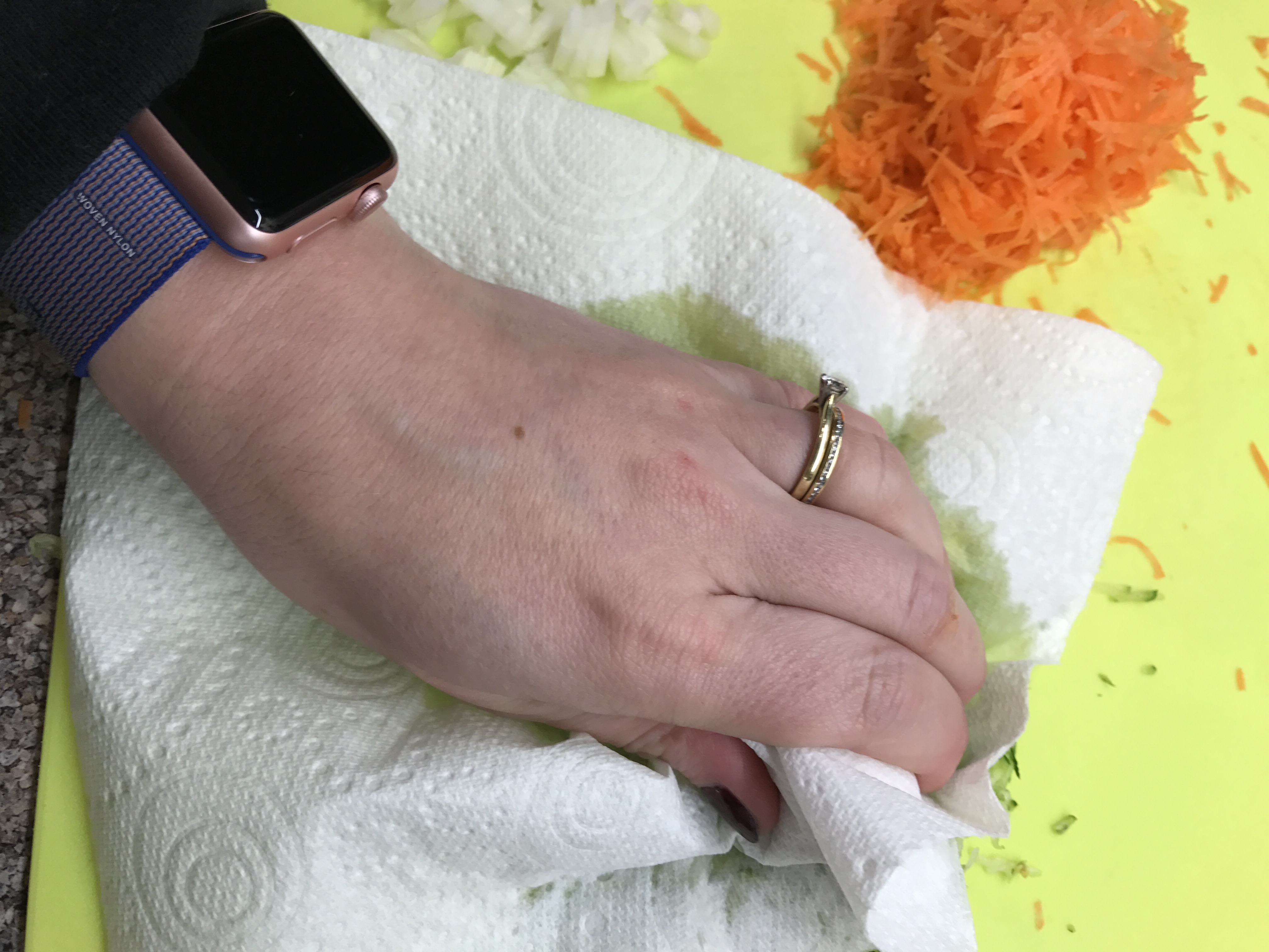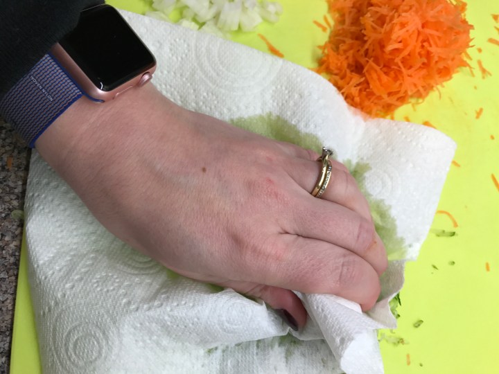 Pick up a handful of the grated courgette and carrot and squeeze as much juice out into the sink as you can then use a paper towel to get the last moisture out as in the picture.