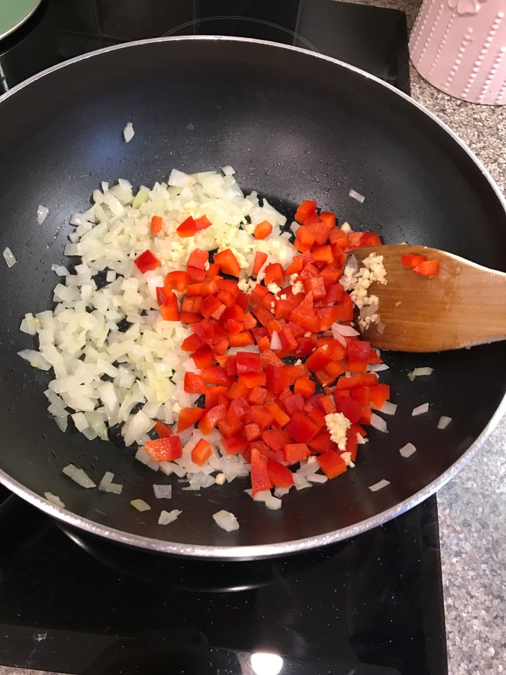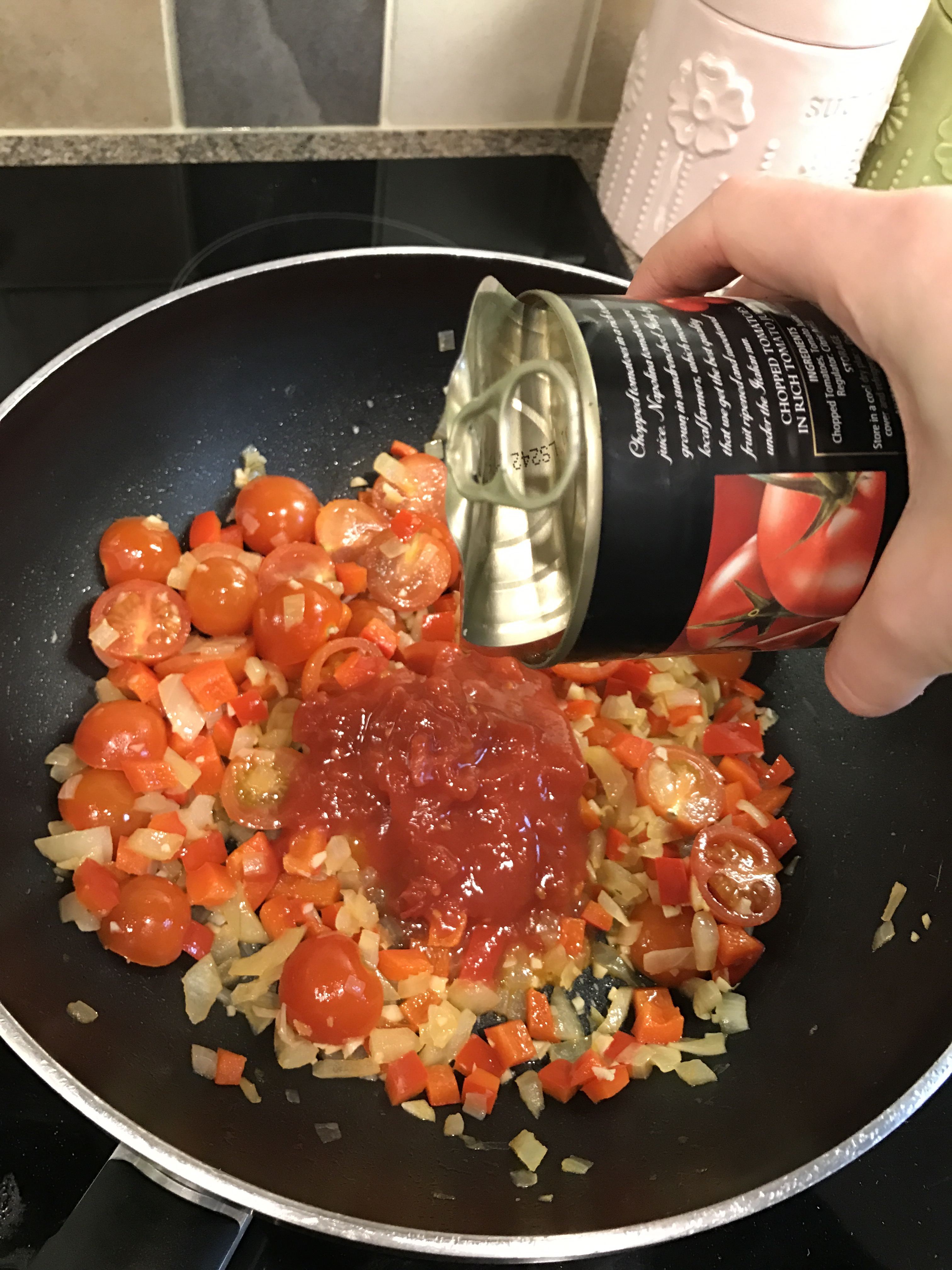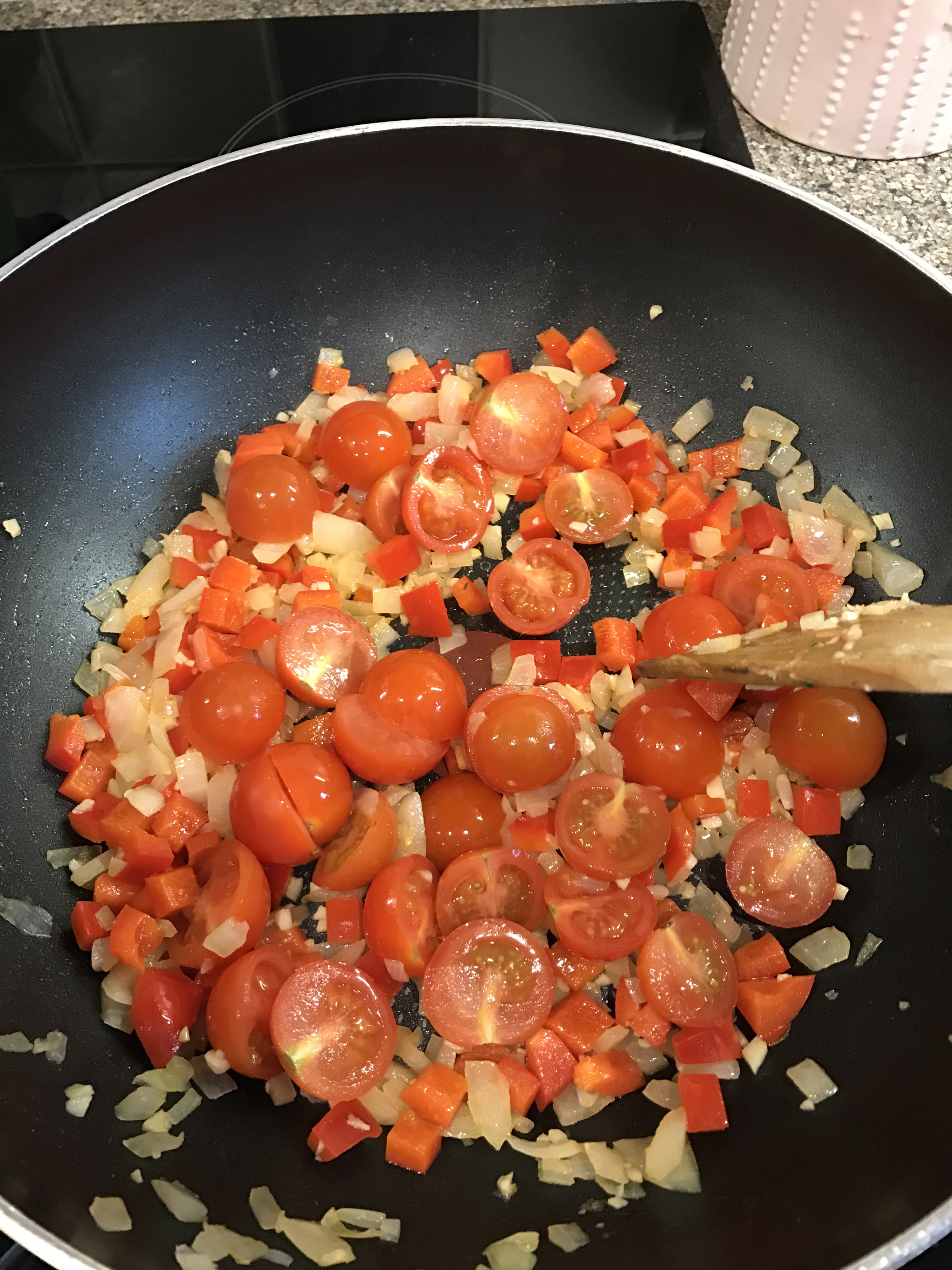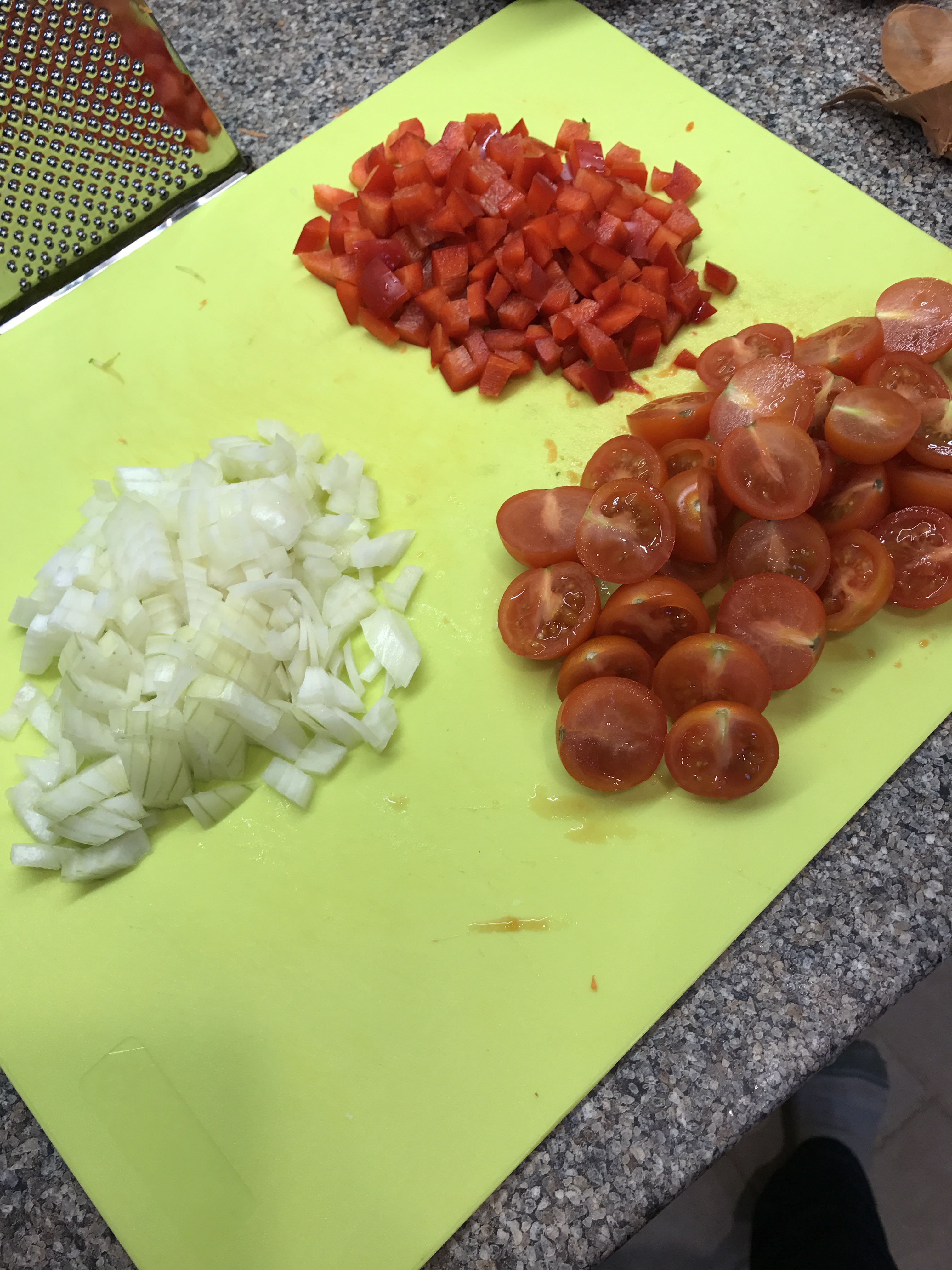 Meanwhile- Finely chop the large onion, cut the pepper into small cubes and cut the cherry tomatoes in half. Also- finely chop the garlic (forgot to do that before I took the pic!)