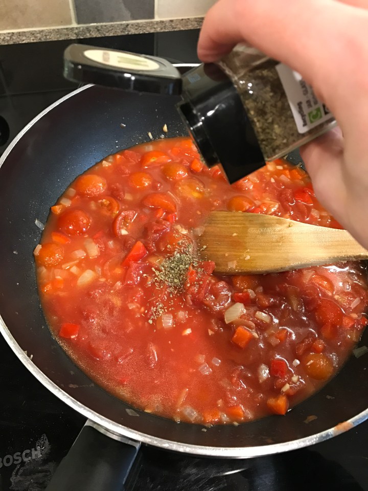 Add a tsp of basil, a tsp of oregano, a tsp of marjoram, plenty of black pepper and a little salt