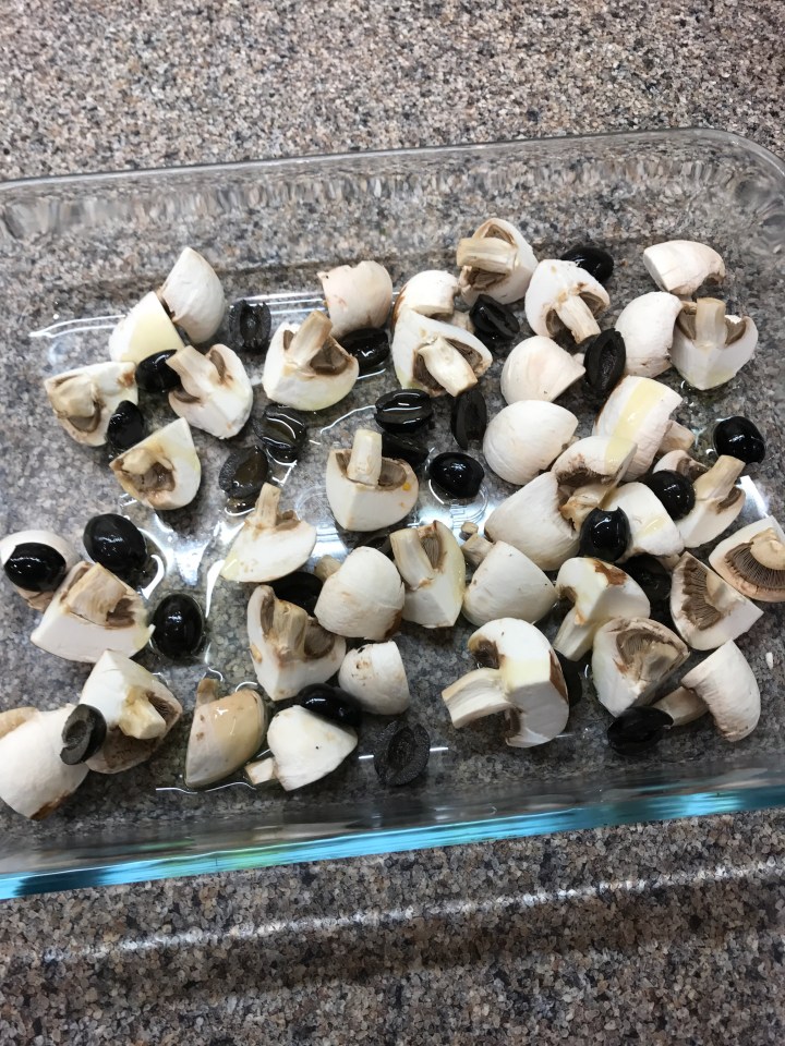 Meanwhile- peel and chop 10-12 mushrooms into quarters and cut a handful of black olives in half. Put them into the bottom of an oven proof dish and drizzle a little olive oil over. Pop into the oven for 10mins