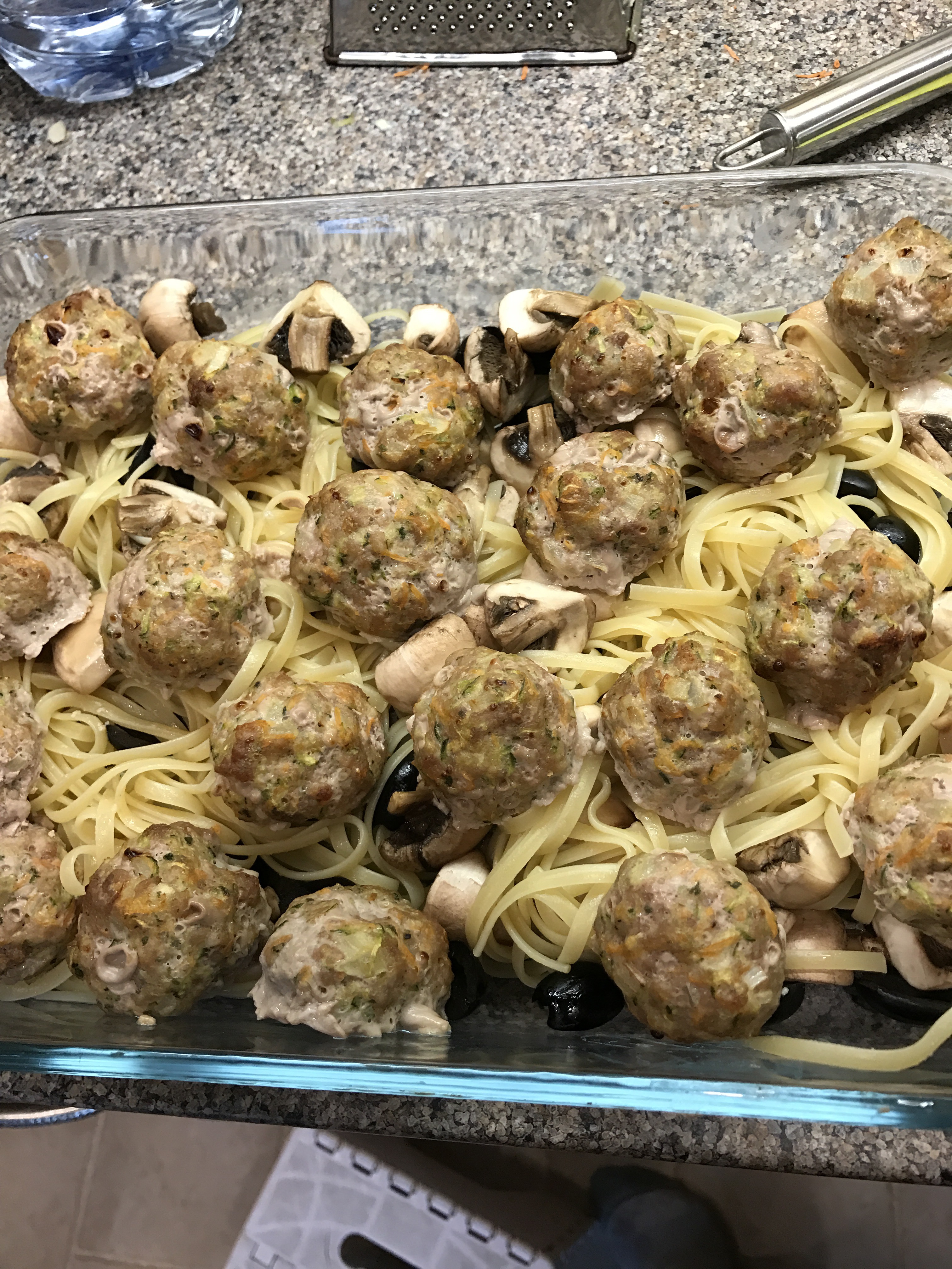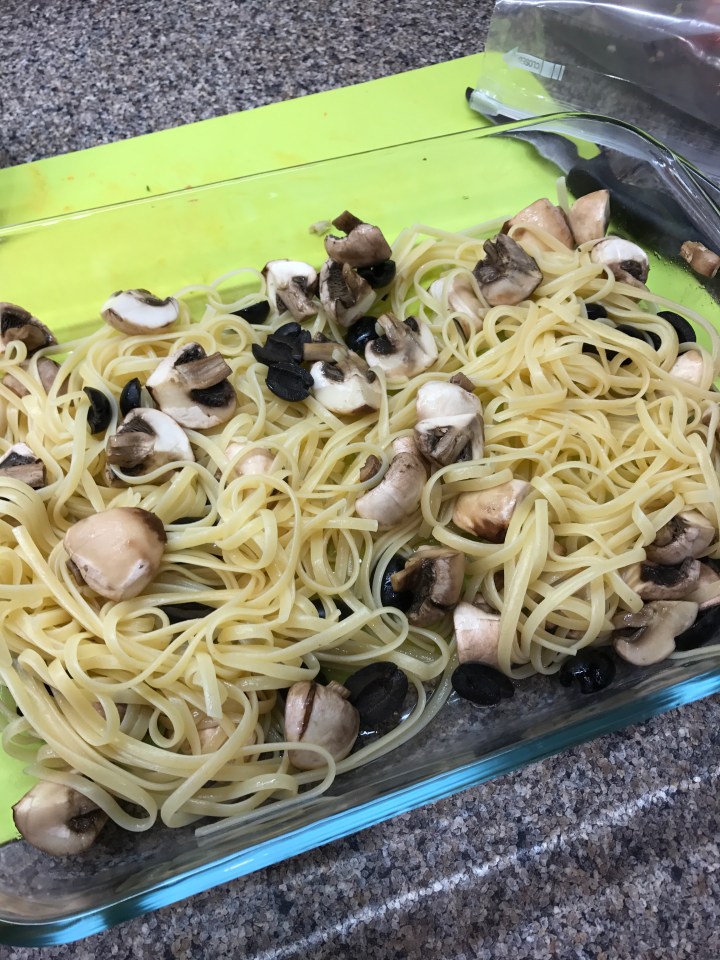 Take the mushroom dish out of the oven and add the cooked linguine, mixing it with the mushrooms and olives