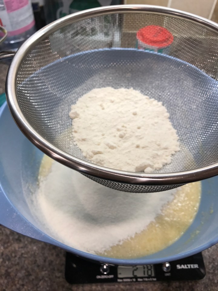 Sieve the flour, baking powder and mixed spice into the bowl and give it another brief mix until it’s almost smooth