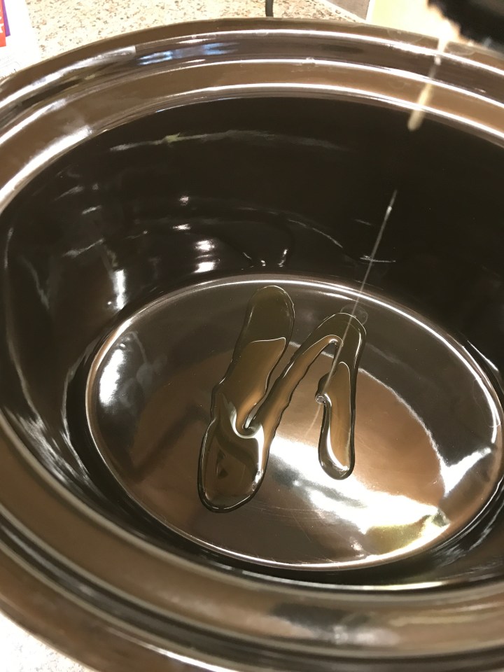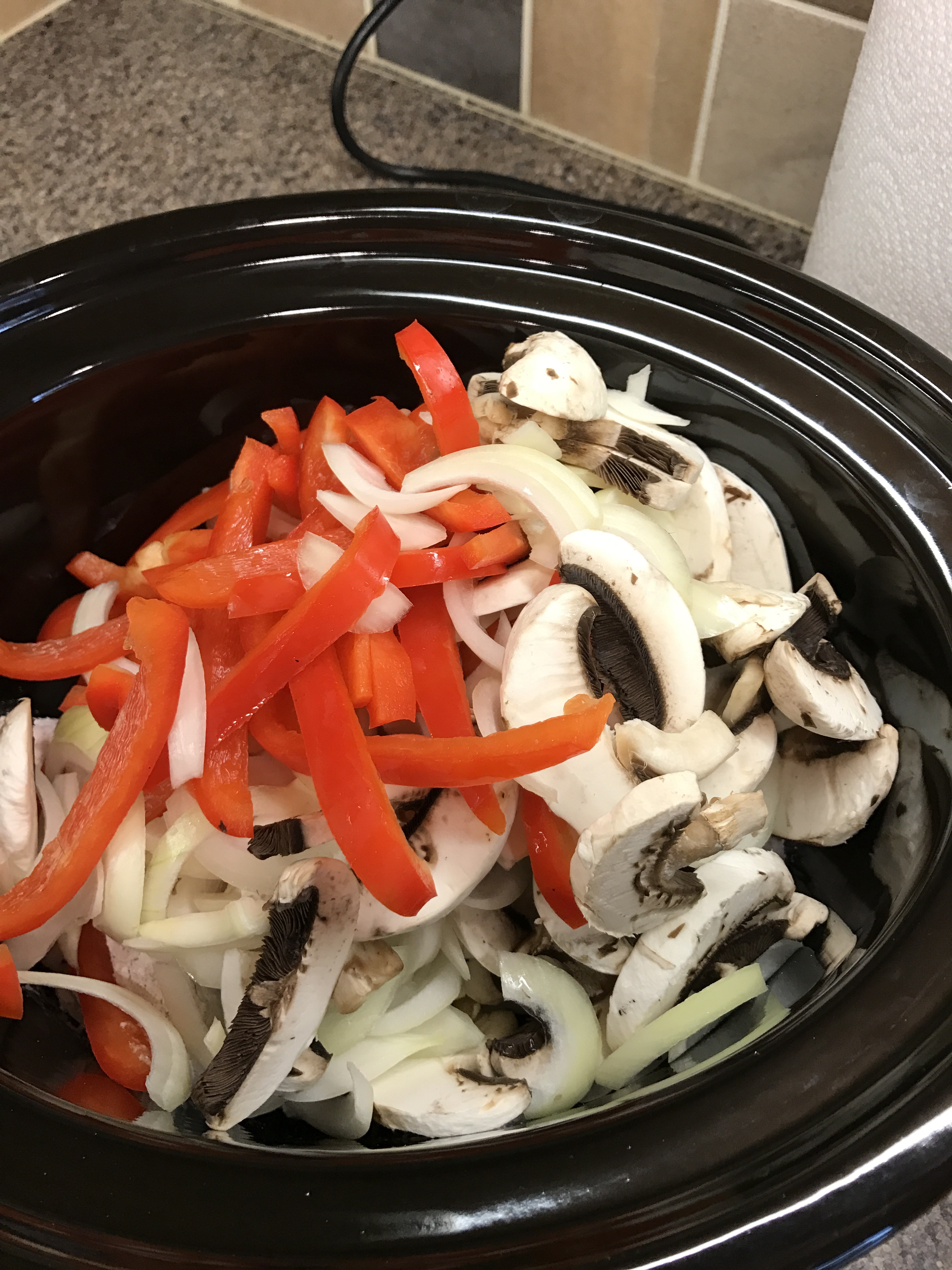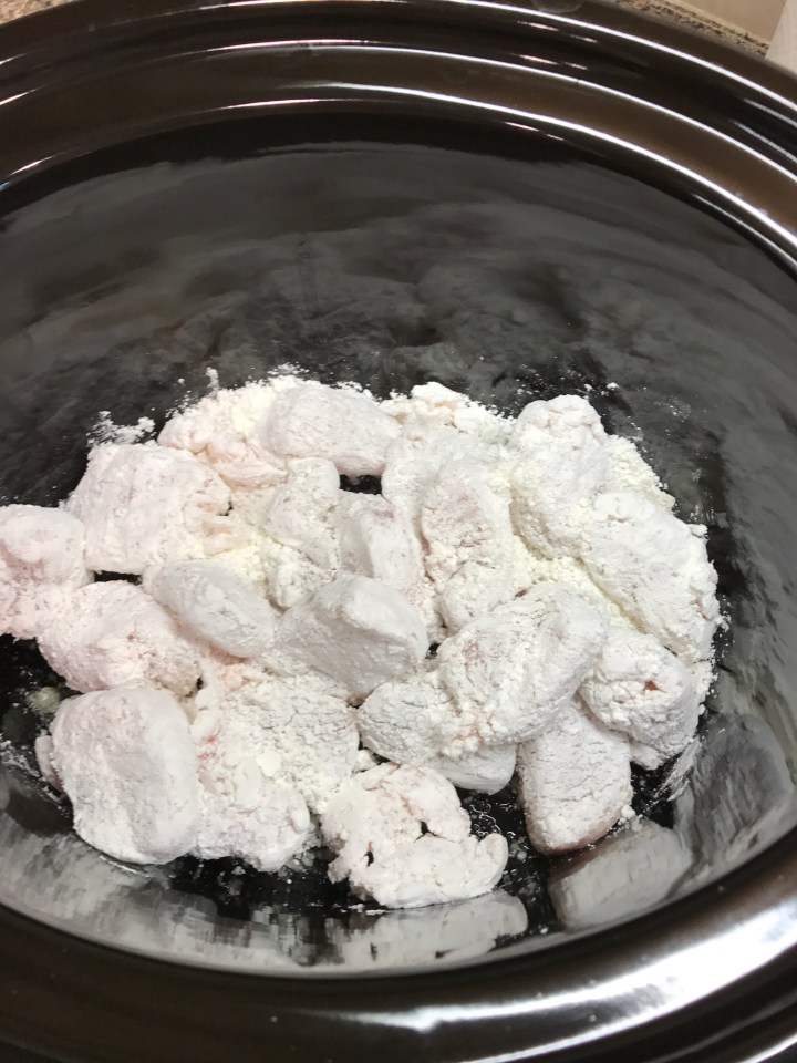 Place the floured chicken into the slow cooker- try to spread it so every piece touches the bottom.