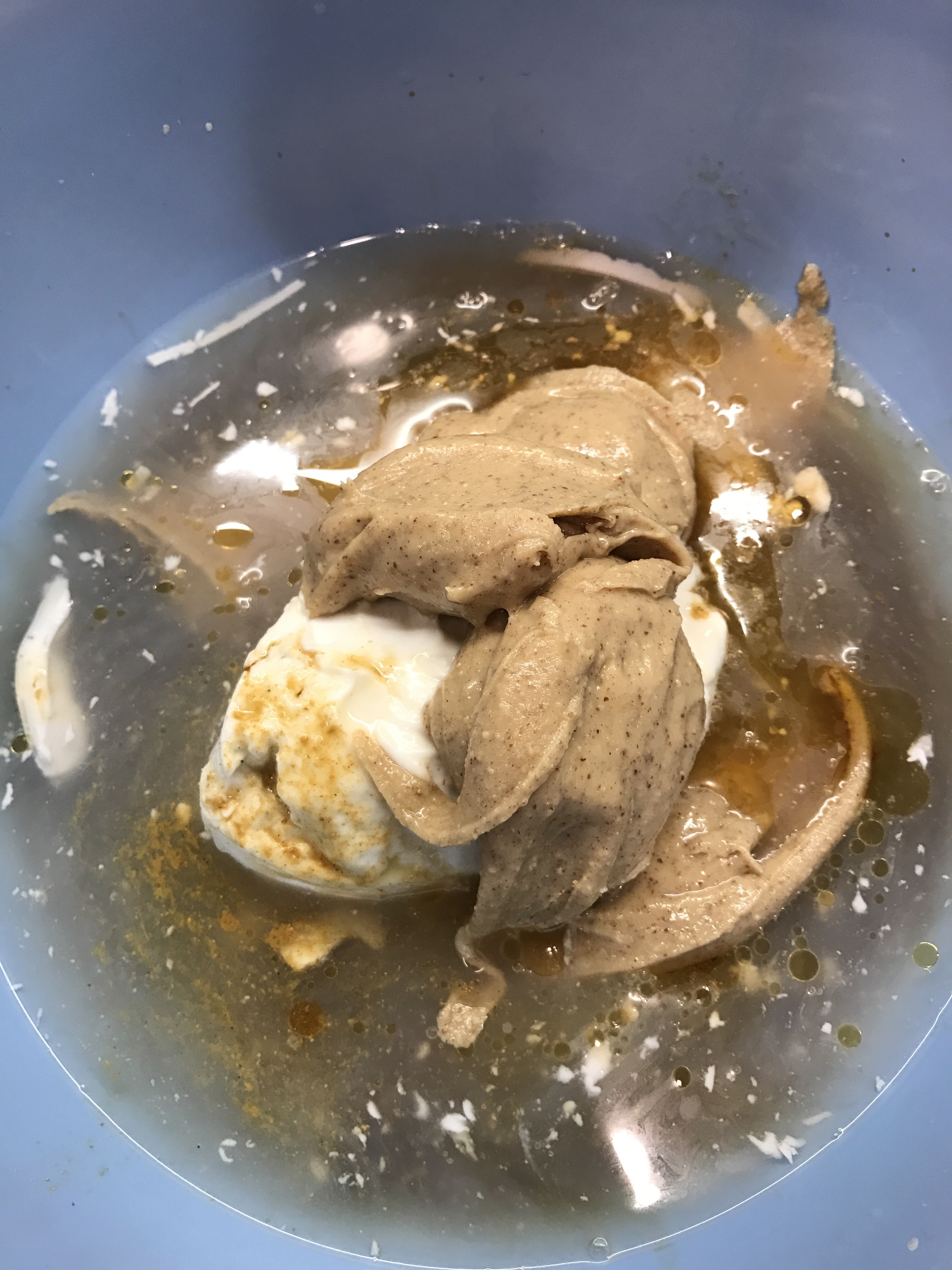 Add the ginger, rice wine, soy sauce, peanut butter, sesame oil and honey