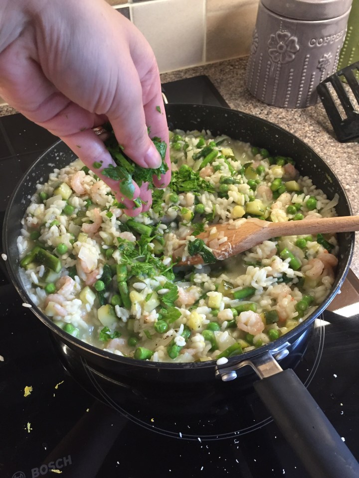 Dinner- Prawn and green vegetable risotto (9) and satsuma (10!)