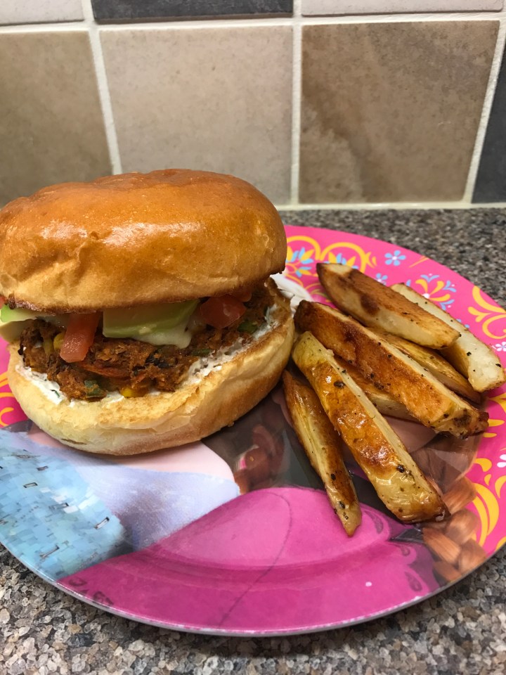 Dinner- bean burgers with sweet potato chips (9) and mango (10)