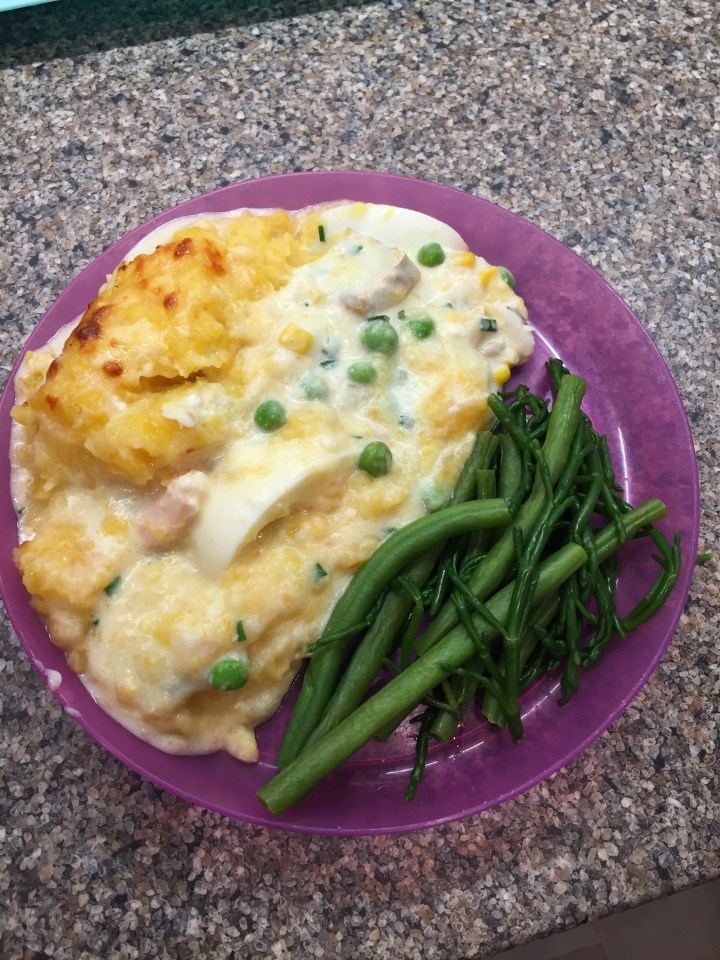 Dinner- swede topped fish pie with green beans (9) and banana nice cream (10!)
