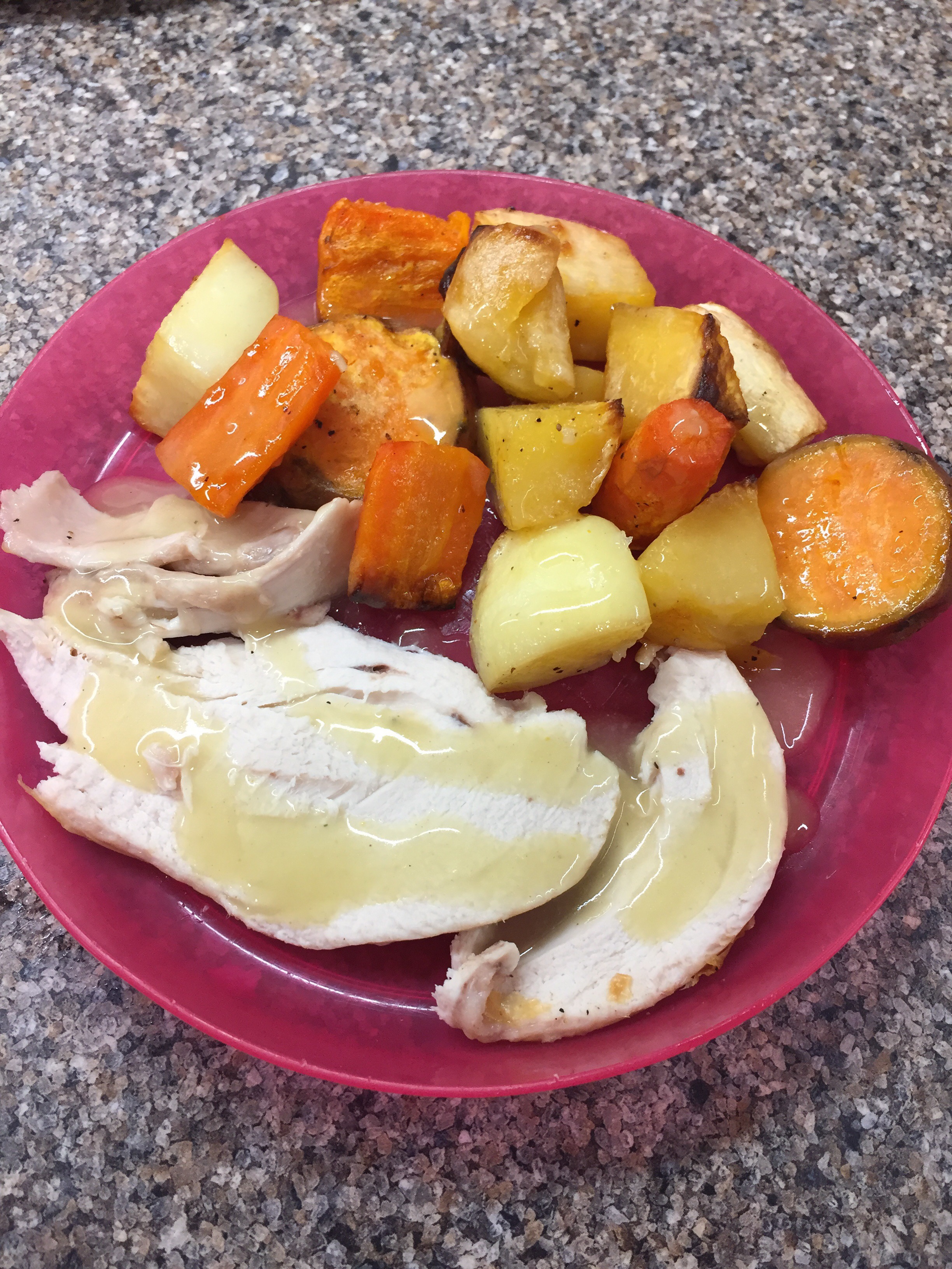 Lunch- Roast chicken, mushroom stuffing, maple roast roast vegetables (8)