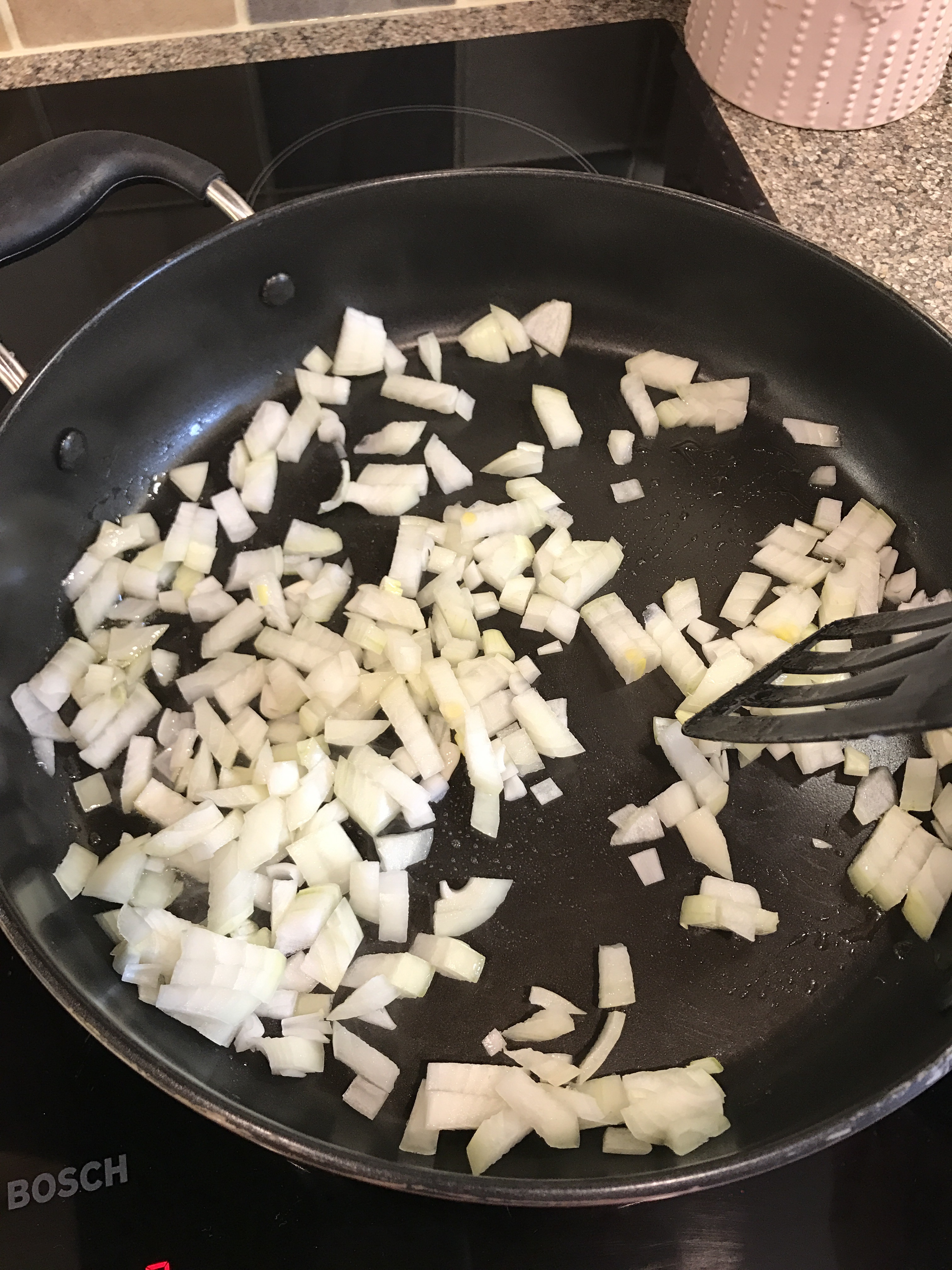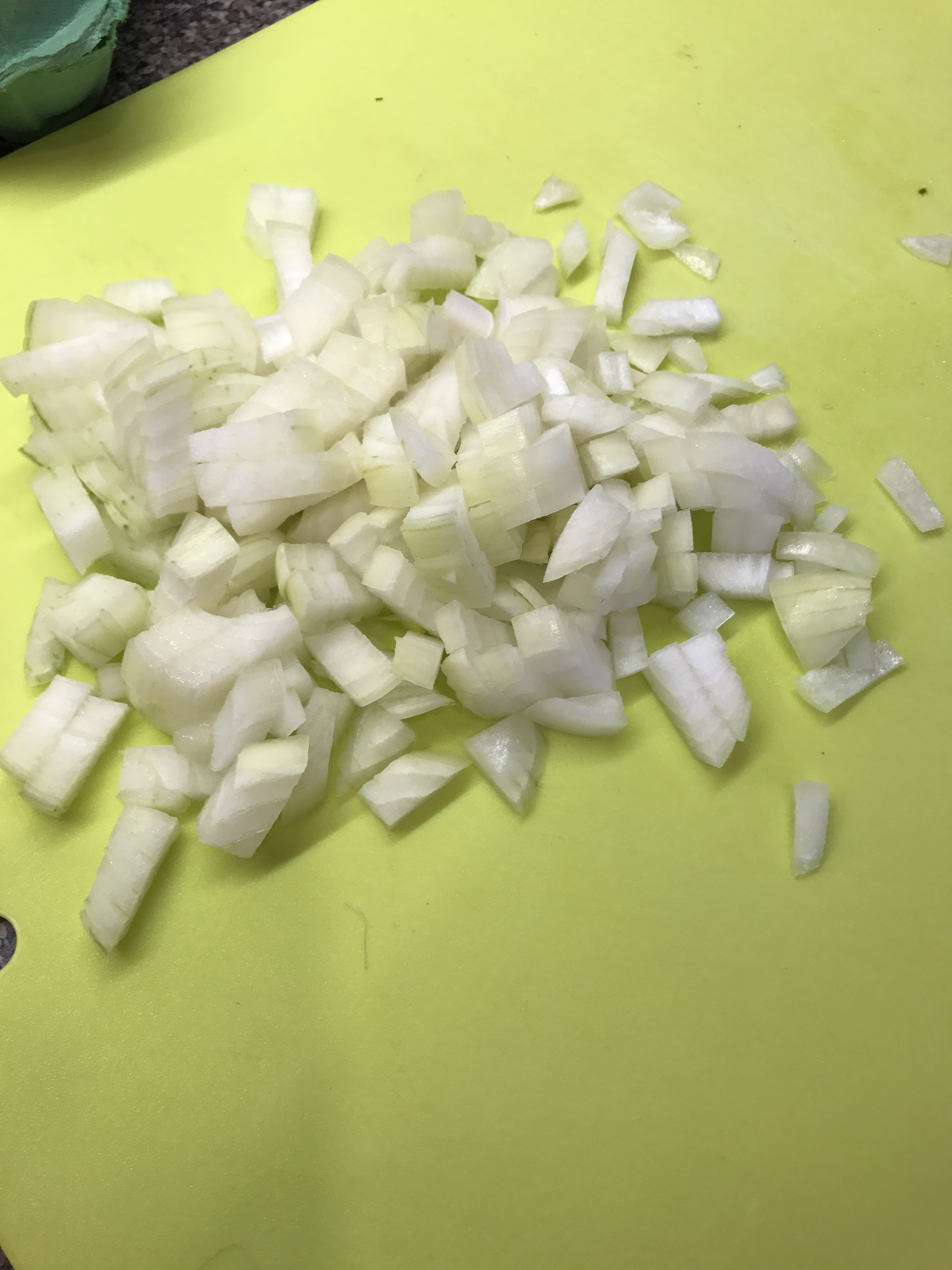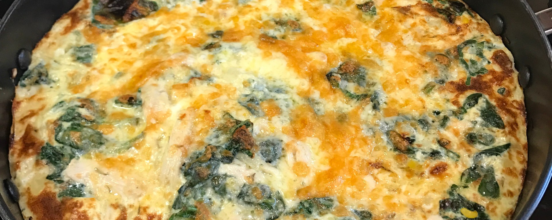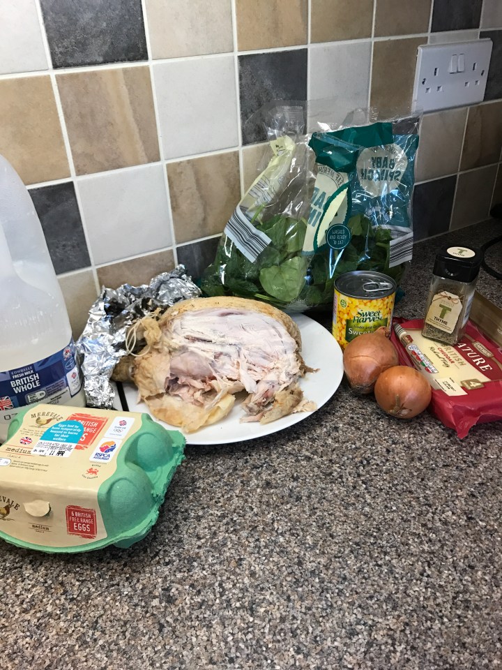 I’m using up left over roast chicken but if you wanted to simply buy one chicken breast and grill it that should be enough to do the whole frittata.