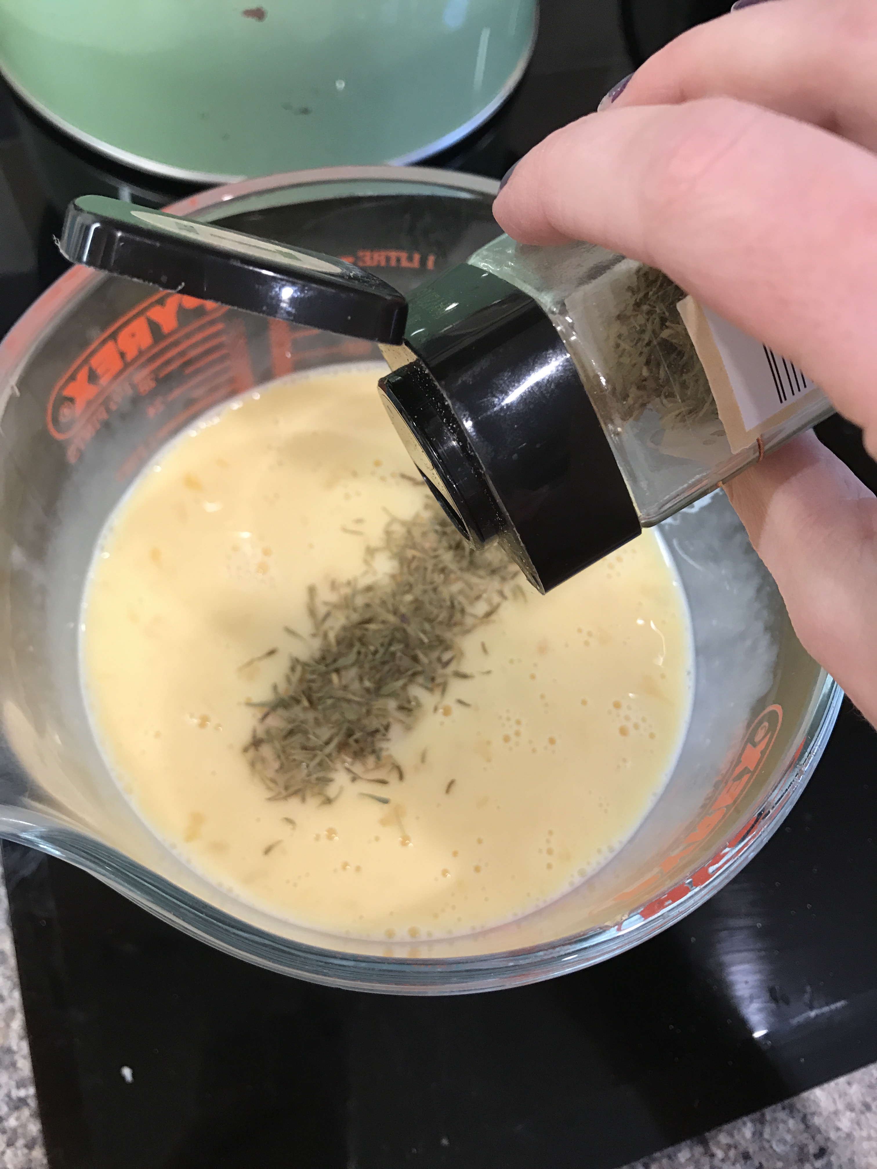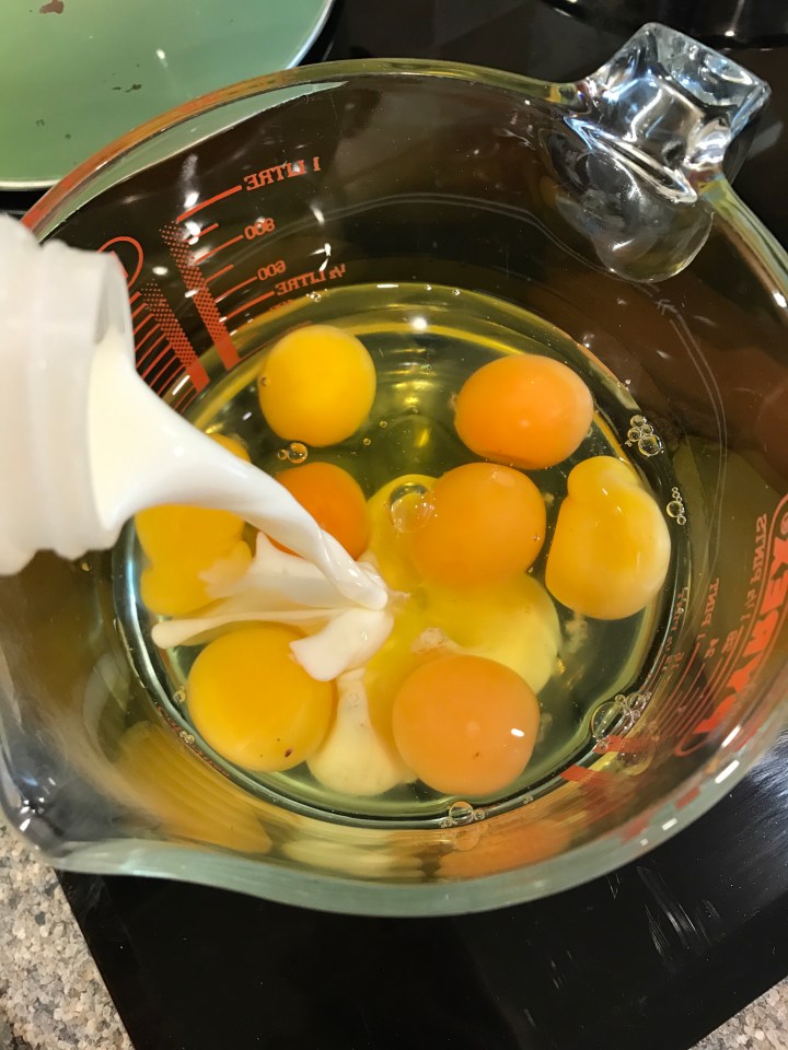 Crack the eggs into a mixing jug and add around 150ml of milk (preferably full fat milk!) whisk together with a fork or whisk