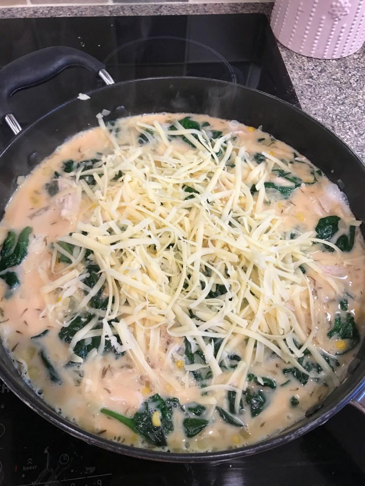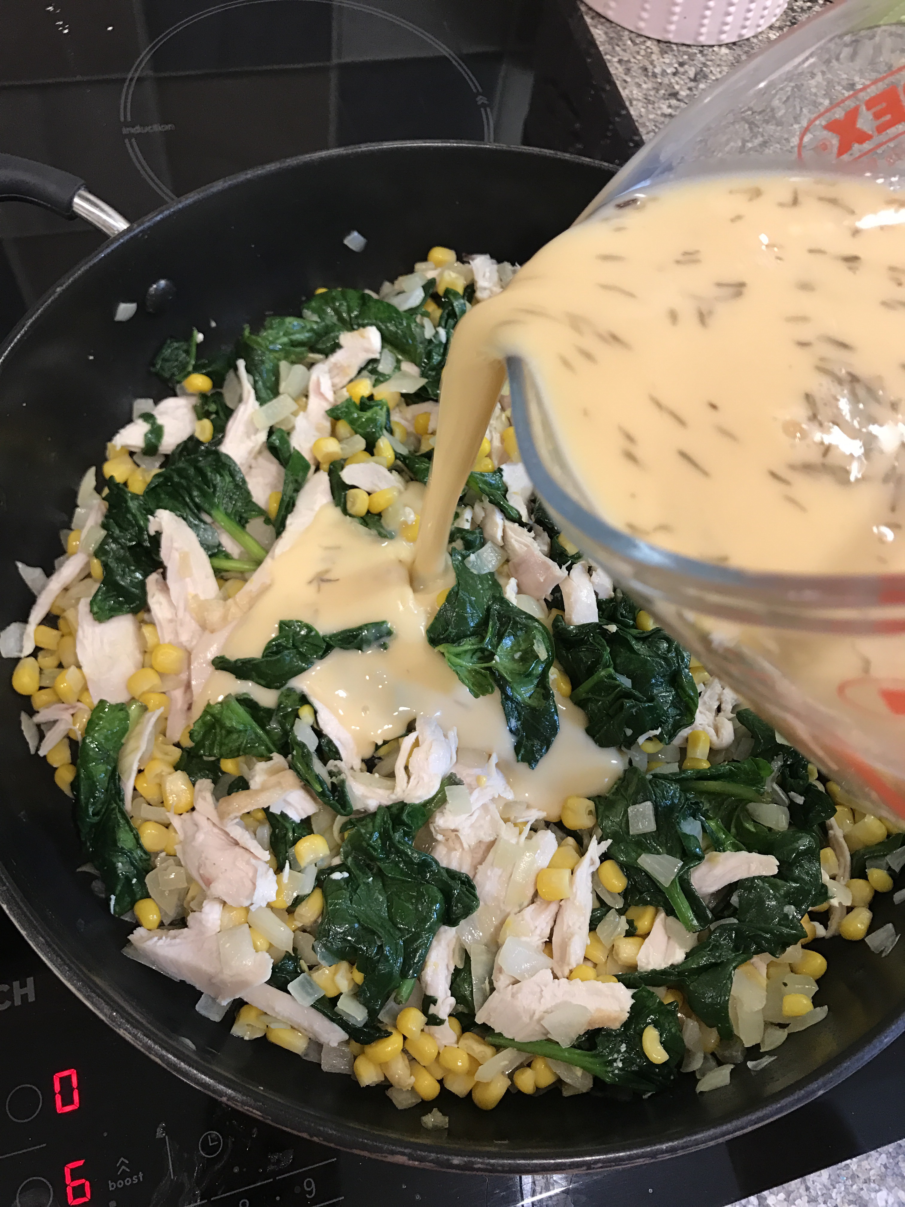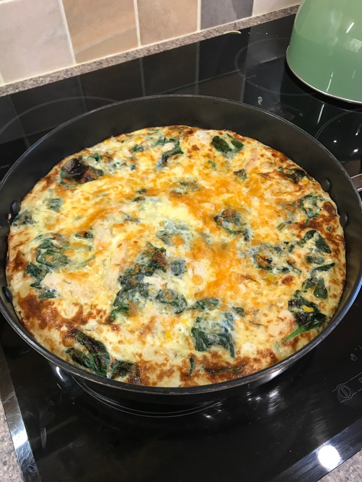 Pop the lid on the pan and cook on a medium heat for around 10mins until it’s almost set on top but still slightly liquidy!