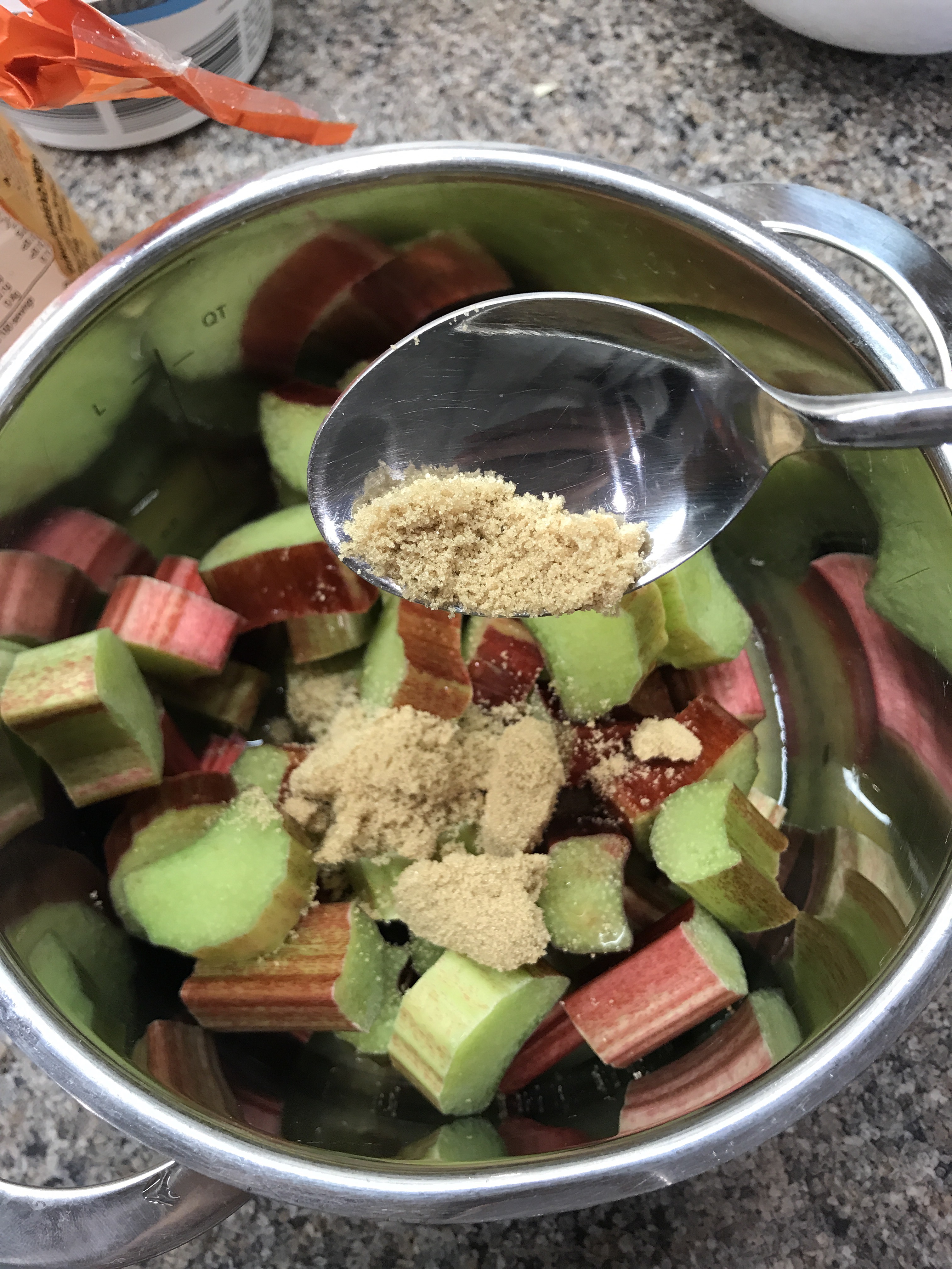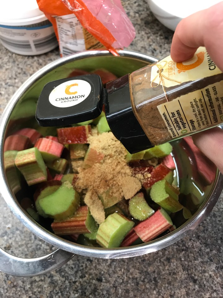 Slice the rhubarb into 1 inch pieces and pop into a pan. Add a tablespoon of brown sugar (a little more if you’d like it a touch sweeter)