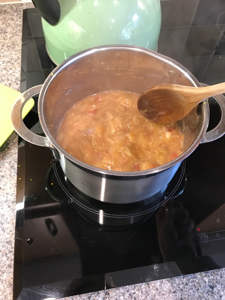 Once it starts to break down like this you can remove the pan lid and cook for another 5mins to thicken slightly