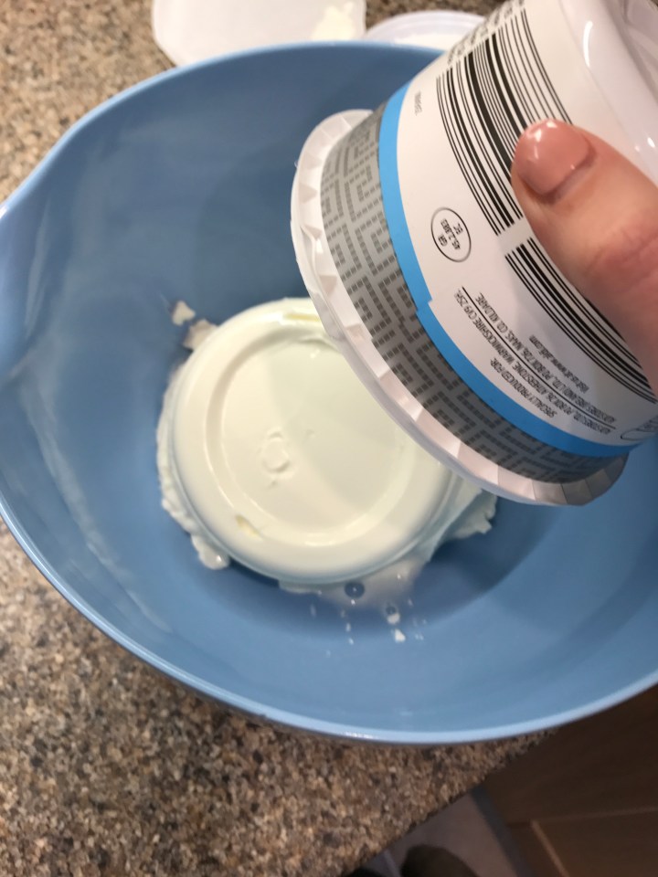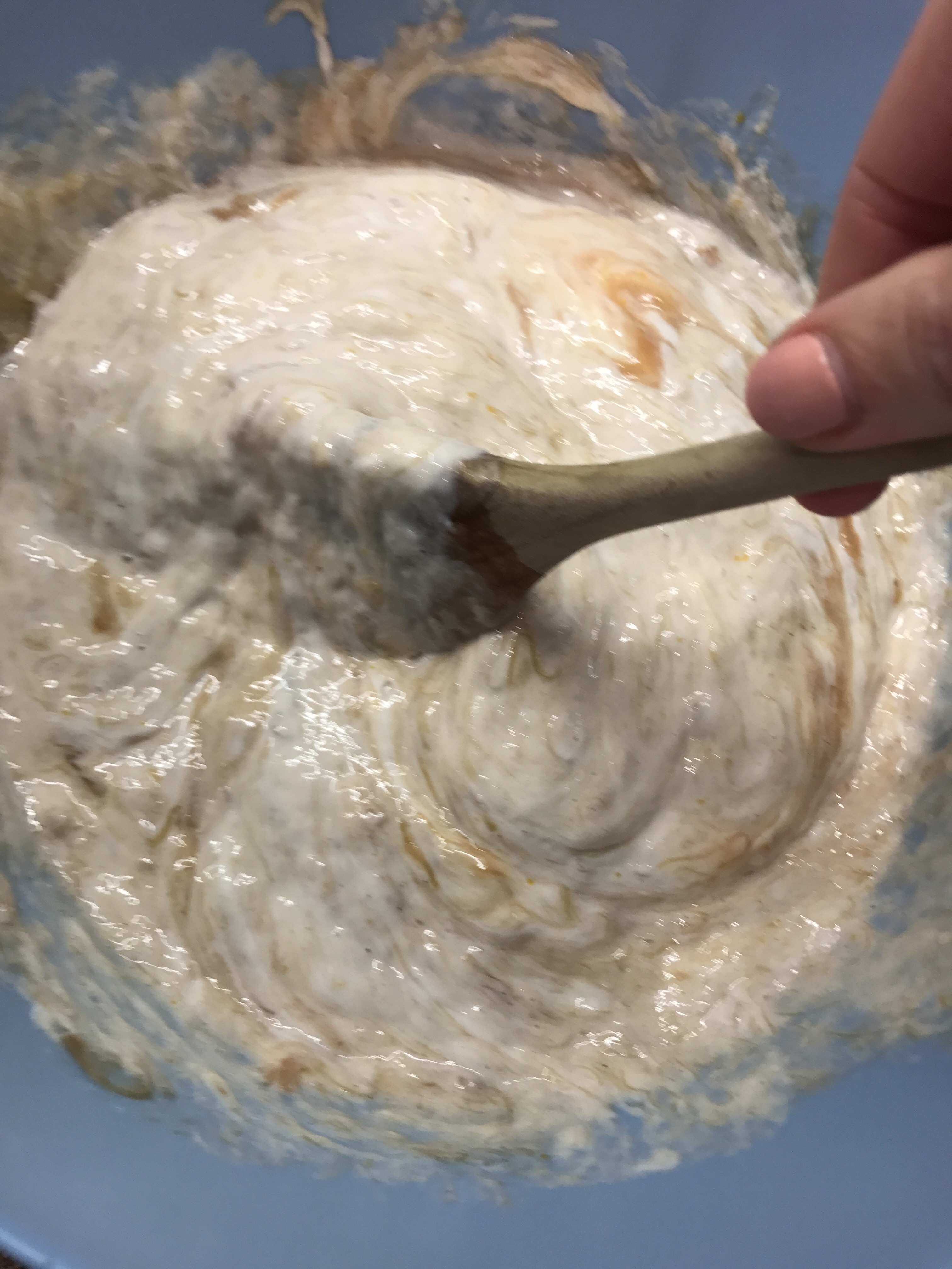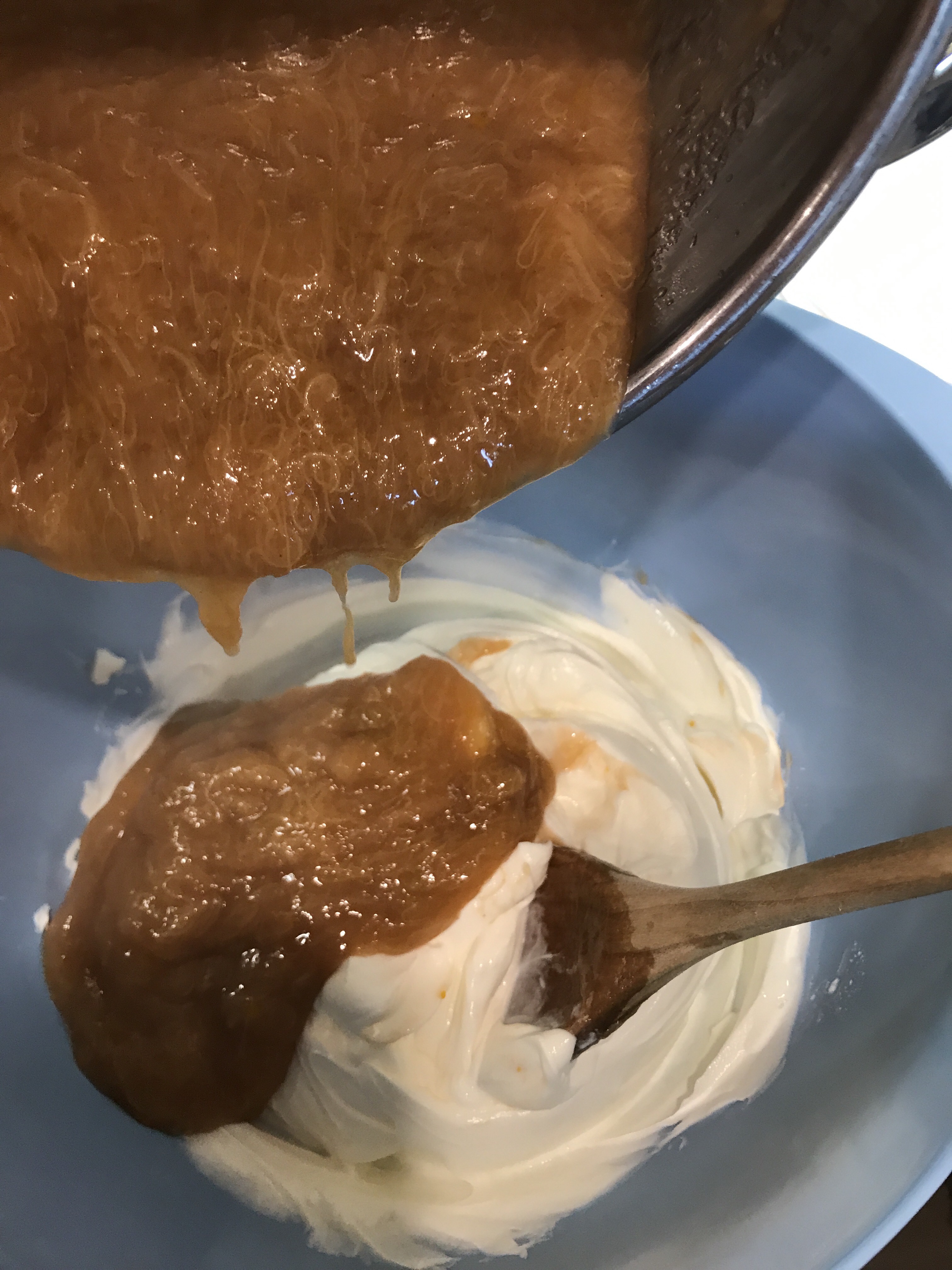 Add the rhubarb mixture to the bowl a little at a time mixing it in as you go